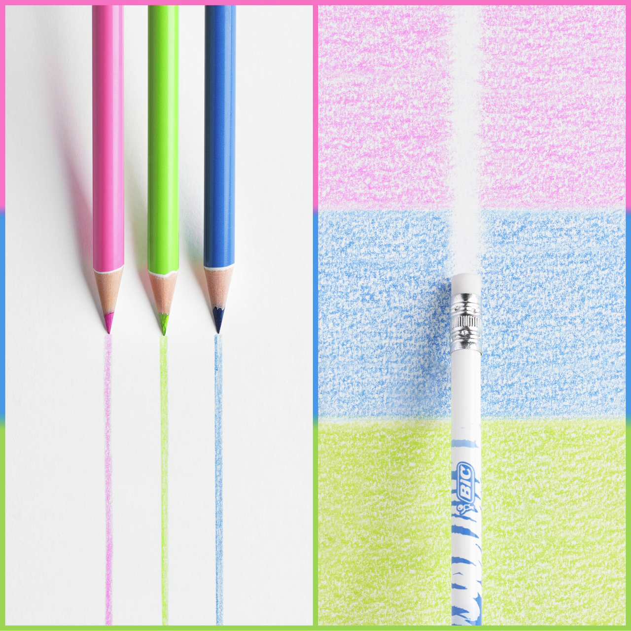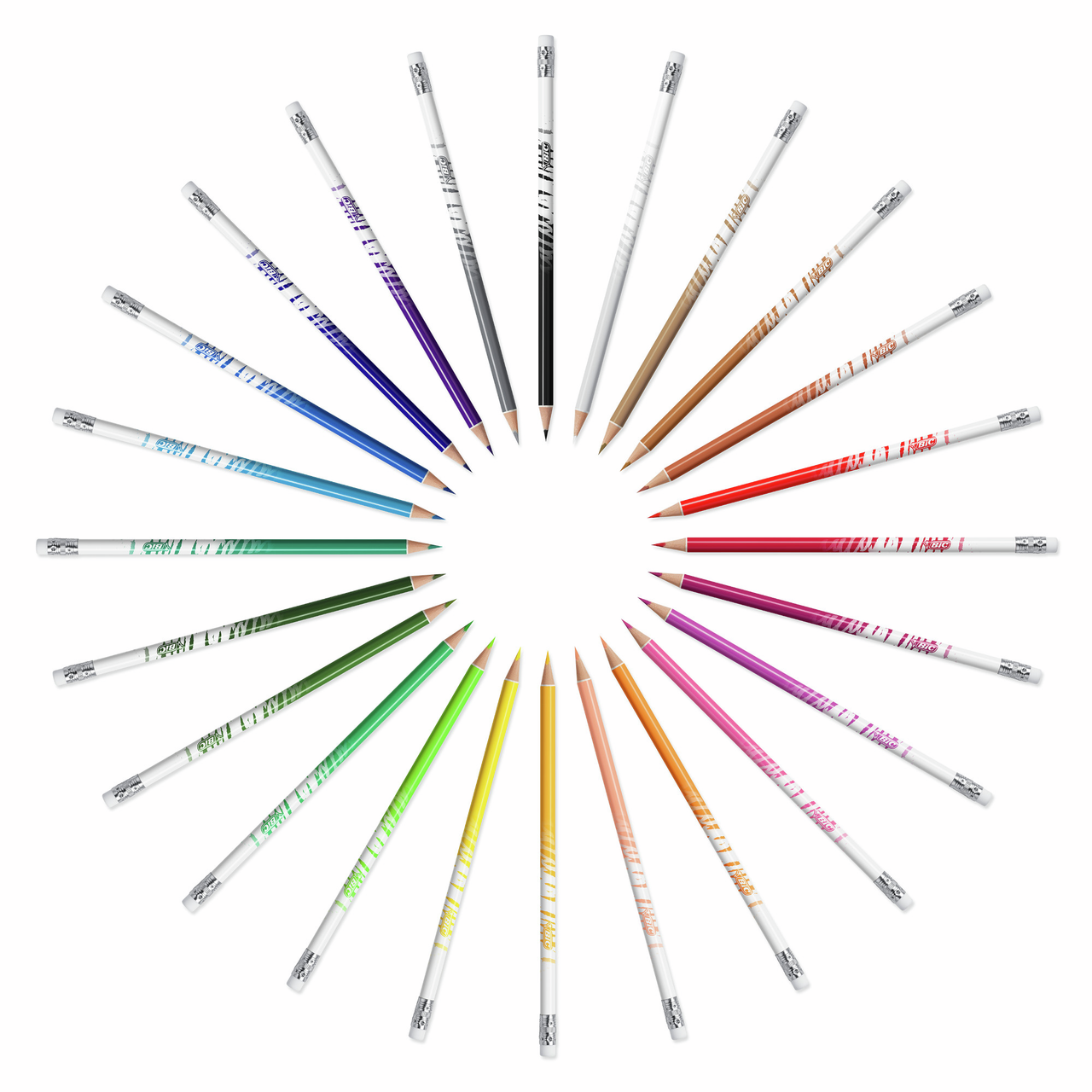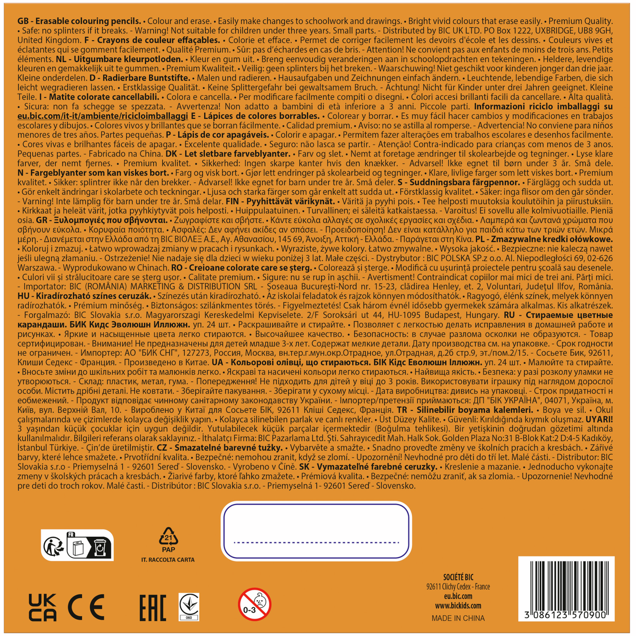 Карандаши BIC с ластиком 24 цвета – настоящая палитра цветов, разнообразие и обилие оттенков которой покорит сердце любого маленького художника. В яркой, красочной коробке собраны все цвета радуги вместе с оттенками, поэтому вашему малышу будет просто фантазировать и реализовывать свои задумки, выливать радости и мечты на бумагу, сочинять сказки в картинках, делать подарки родным к праздникам своими руками. Канцтовары производителя BIC являются одними из самых качественных на современном рынке, поэтому станут настоящей находкой для мам, которые собирают папки для творчества с детский сад или школу, готовят необходимые инструменты для работы ребенка в изостудии. Благодаря удобной шестигранной форме корпуса малышу будет очень удобно держать карандаш в руках, учиться правильно располагать пальчики щепотью, как того требуют в школе. Прочное и плотное дерево основания изделия не крошится и не оставляет заусенцев при заточке. Грифели мягкие, даже при небольшом усилии оставляют на бумаге четкий и яркий след.