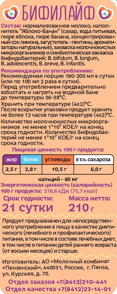 Это кисломолочный напиток с добавлением натурального фруктового пюре, предназначенный для питания детей старше 8 месяцев. Он приготовлен из нормализованного по уровню жирности молока и симбиотической закваски из пяти видов живых бифидобактерий. Продукт не содержит консервантов и искусственных добавок.