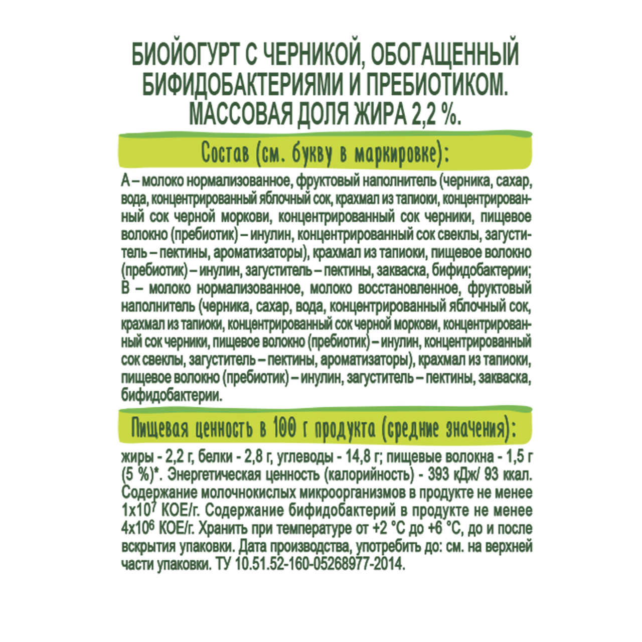 Биойогурт с черникой, обогащенный бифидобактериями и пребиотиком. массовая доля жира 2,2%А – молоко нормализованное, фруктовый наполнитель (черника, сахар, вода, концентрированный яблочный сок, крахмал из тапиоки, концентрированный сок черной моркови, концентрированный сок черники, пищевое волокно (пребиотик) – инулин, концентрированный сок свеклы, загуститель – пектины, ароматизаторы), крахмал из тапиоки, пищевое волокно (пребиотик) – инулин, загуститель – пектины, закваска, бифидобактерии;в – молоко нормализованное, молоко восстановленное, фруктовый наполнитель (черника, сахар, вода, концентрированный яблочный сок, крахмал из тапиоки, концентрированный сок черной моркови, концентрированный сок черники, пищевое волокно (пребиотик) – инулин, концентрированный сок свеклы, загуститель – пектины, ароматизаторы), крахмал из тапиоки, пищевое волокно (пребиотик) – инулин, загуститель – пектины, закваска, бифидобактерии.