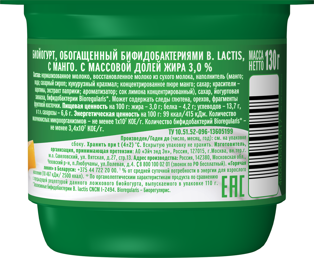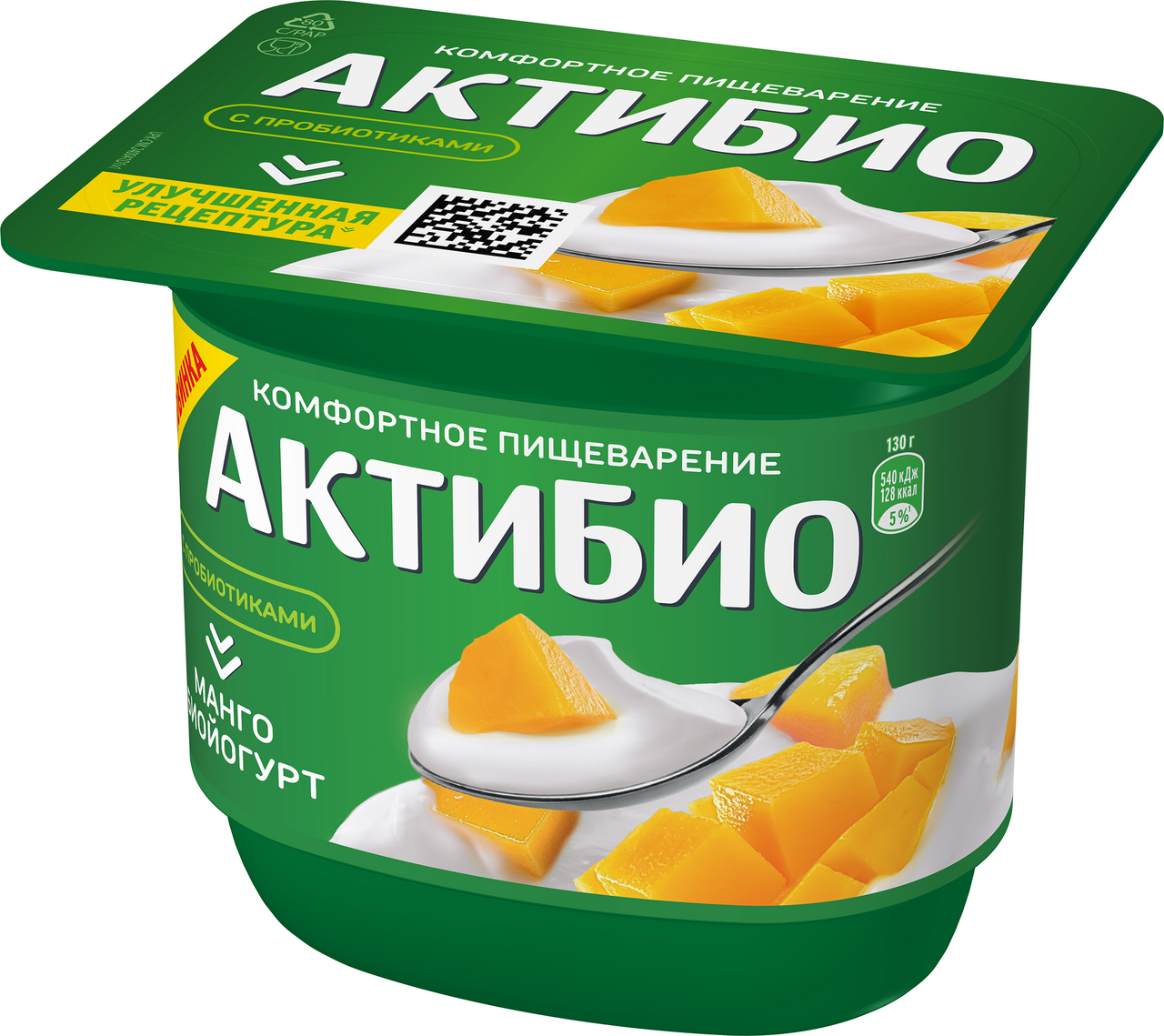 Нормализованное молоко, восстановленное молоко из сухого молока, наполнитель (вода, сахар, манго, стабилизатор — Е1442, концентрированное пюре манго, красители — каротины, экстракт паприки, ароматизатор, регулятор кислотности — лимонная кислота), сахар, йогуртовая закваска, бифидобактерии B. Lactis.