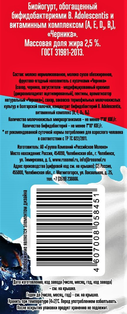 Молоко нормализованное, молоко сухое обезжиренное, фруктово-ягодный наполнитель с кусочками Черника сахар, черника, загустители - модифицированный крахмал дикрахмаладипат ацетилированный, пектины, ароматизатор натуральный Черника, сахар, закваска термофильных молочнокислых культур и болгарской палочки, концентрат бифидобактерий B Adolescentis, витаминный комплекс А, Е, D3, B6.