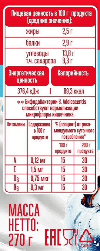 Биойогурт, обогащённый бифидобактериями B. Adolescentis и витаминным комплексом (А, Е, D3, В6). Произведен с использованием пробиотической закваски, которая благоприятно влияет на работу желудочно-кишечного тракта. Для производства йогурта используется натуральное сырье и джемы из сибирских ягод. Продукт, с коротким сроком годности, без стабилизатора и консервантов. Пользуется спросом у людей различных возрастов, особенно у детей, молодых людей. Вкусный и ароматный перекус.