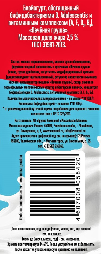 Молоко нормализованное, молоко сухое обезжиренное, фруктово-ягодный наполнитель с кусочками Печеная груша сахар, груша дробленая, загуститель модифицированный крахмал дикрахмаладипат ацетилированный, регулятор кислотности лимонная кислота, ароматизатор пищевой Печеная груша, сахар, закваска термофильных молочнокислых культур и болгарской палочки, концентрат бифидобактерий B Adolescentis, витаминный комплекс А, Е, D3, B6.