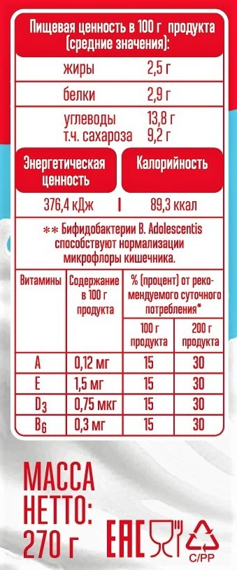 Это вкусный и полезный кисломолочный продукт, изготовленный из молока высшего сорта и специальной заквасочной культуры, обогащённый бифидобактериями В. Adolescentis и витаминным комплексом (A, E, D3, B6). Напиток содержит комплекс витаминов, а также полезные бифидобактерии, которые нормализуют работу желудочно-кишечного тракта. В меру сладкий с кисловатым послевкусием прекрасно подходит как для завтрака, так и для легкого перекуса в течение дня. Его добавляют в творог, коктейли, заправляют им салаты.