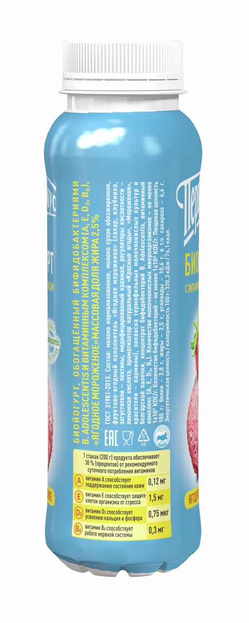 Молоко нормализованное, молоко сухое обезжиренное, фруктово-ягодный наполнитель Ягодное мороженое (сахар, клубника, загустители – пектины, модифицированный крахмал, регуляторы кислотности – лимонная кислота, ароматизатор натуральный Красные ягоды, Мороженое, красители – кармины), закваска термофильных молочнокислых культур и болгарской палочки, концентрат бифидобактерий B. Adolescentis, витаминный комплекс (А, Е, D3, B6).