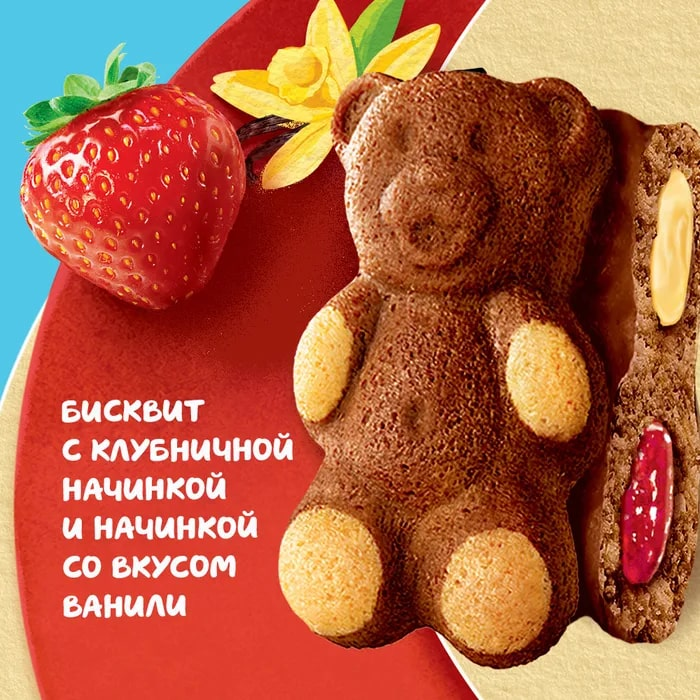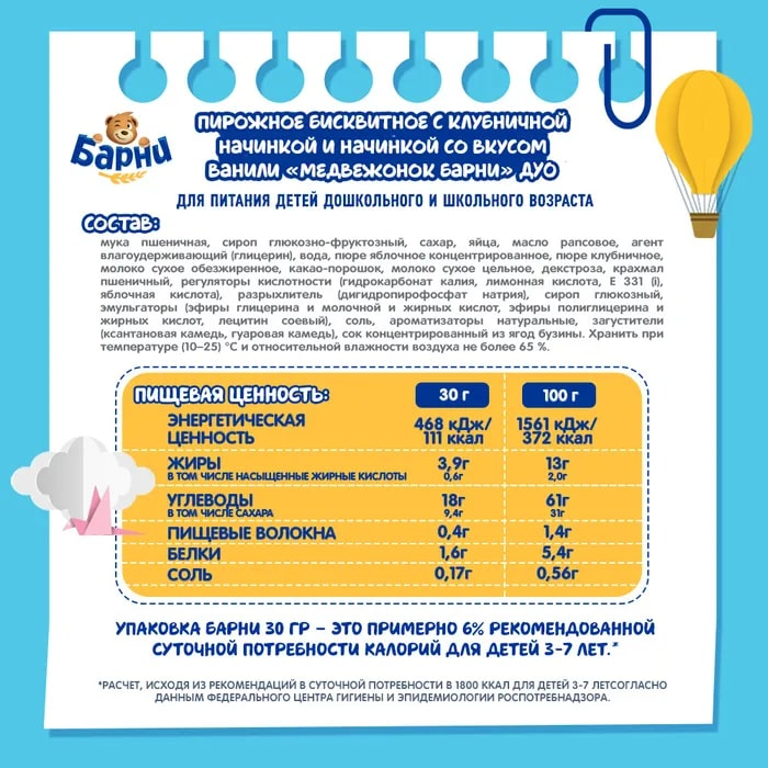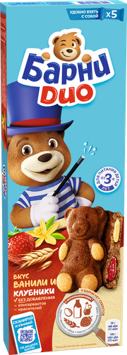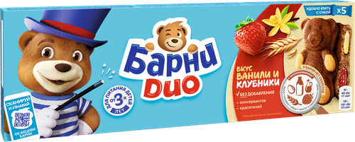 Бисквитное пирожное Барни DUO с двойной начинкой Клубника и Ванильный крем - специально разработанное для детей кондитерское изделие в виде медвежонка, производится на основе натуральных ингредиентов: злаков и молочных продуктов. Обогащено кальцием, необходимым для здорового роста и развития детей, не содержит красителей и консервантов. Рекомендовано для детей дошкольного возраста от 3х лет. Медвежонок Барни - вкусный, полезный и питательный перекус, прекрасная альтернатива печенью, кексам или другой сладкой выпечке, отлично сочетается с соком, молоком, кефиром, йогуртом, чаем или какао, его удобно брать с собой в дорогу, давать ребенку в школу или на прогулку. Это отличный вариант сладкого угощения на детский праздник в детский сад, школу, на День рождения. В коробке пять пирожных в индивидуальных упаковках. Мишка Барни - это выбор мам, 83% мам купили бы этот вкусный десерт для своего ребенка*.*По результатам исследования ООО "Ипсос Комкон", проведенного в июне 2022г в городах России с населением от 100 тысяч среди женщин25-45 лет с детьми 3-7, покупавших бисквитные пирожные и кексы для своих детей за последние 12 мес.