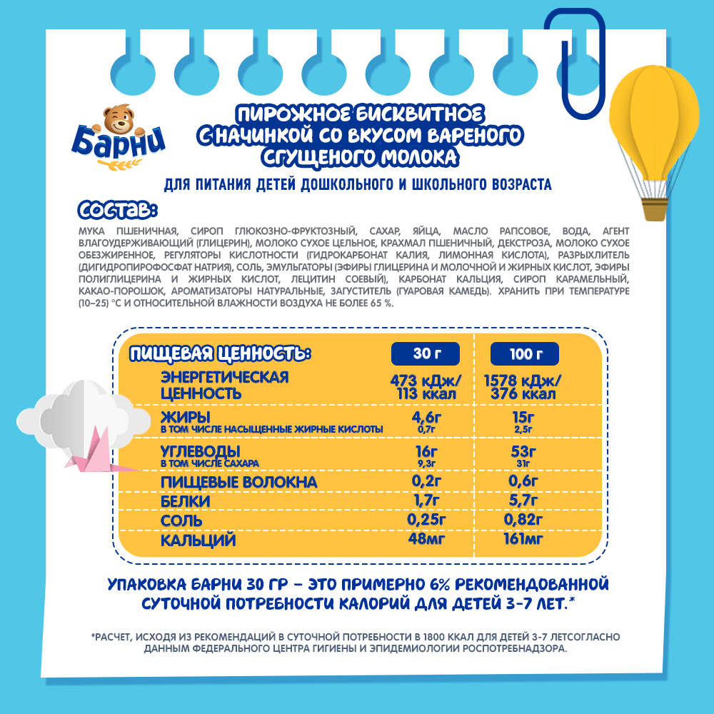 Участвует в конкурсе: Выиграйте кофемашину на сладкое! Совершите покупку товаров-участников на сумму от 1500₽ с 23 октября 2025г. по 14 января 2026г. и получите шанс выиграть кофемашину или другие сладкие призы! Чем больше покупок - тем больше шансов на победу! Подробнее об акции - https://cdn.metro-cc.ru/ru/mndlz_2025.pdf. Пирожное "Медвежонок Барни" - нежное бисквитное лакомство с вареной сгущенкой, которое многие годы занимает одно из лидирующих мест в списке любимых сладостей малышей. Удивительно похожее на маленького медвежонка пирожное с нежной, тягучей вареной сгущенкой внутри - одна из причин, почему маленькому шкоднику нужно срочно съесть кашу, чтобы в награду получить вкуснейший десерт. Лакомство станет отличным перекусом во время прогулки или заменит полноценный полдник со стаканчиком молока.