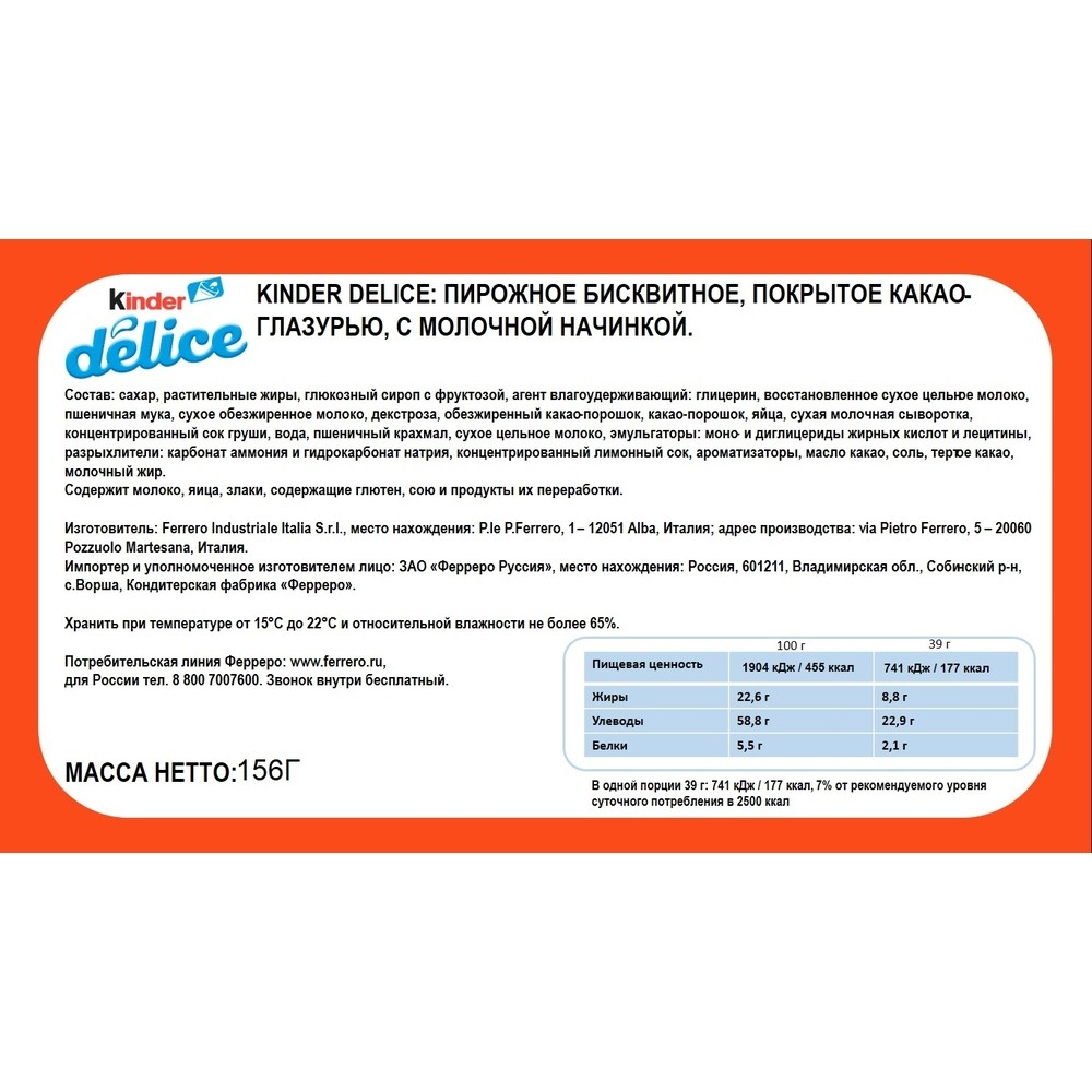 Пирожное Kinder Delice бисквитное покрытое какао глазурью с молочной начинкой 4шт, 156г
