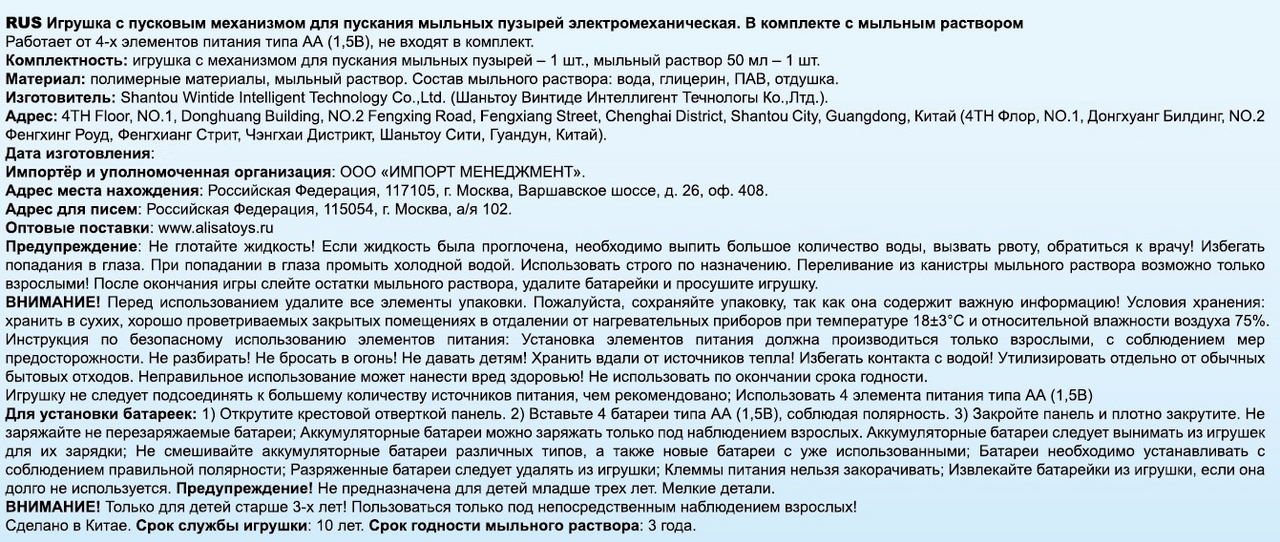 Игрушка для пускания мыльных пузырей в виде бластера. В комплекте 50 мл мыльного раствора. Откройте бутылочку с мыльным раствором и прикрутите к игрушке. Вставьте 4*АА батарейки в игрушку, нажимайте на спусковой крючок и пускайте мыльные пузыри.
