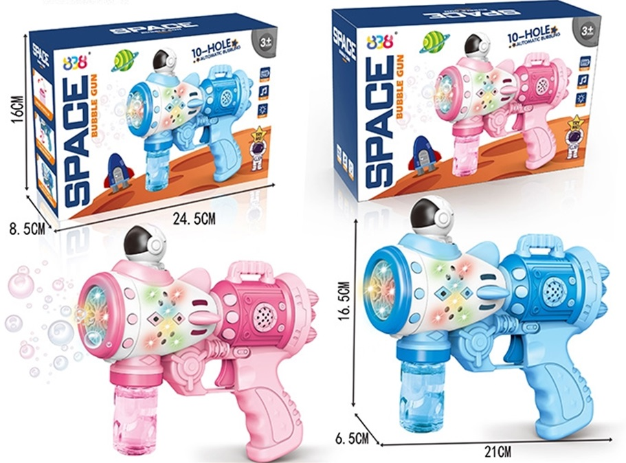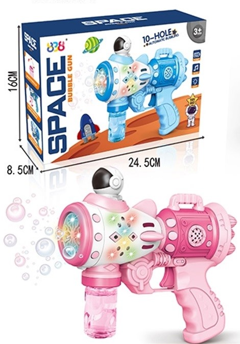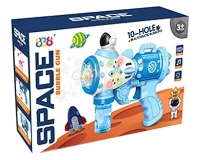 Игрушка для пускания мыльных пузырей со световыми эффектами в виде бластера с фигуркой космонавта. В комплекте 50 мл мыльного раствора. Откройте бутылочку с мыльным раствором и прикрутите к игрушке. Вставьте 4*АА батарейки в игрушку, нажимайте на спусковой крючок и пускайте мыльные пузыри.