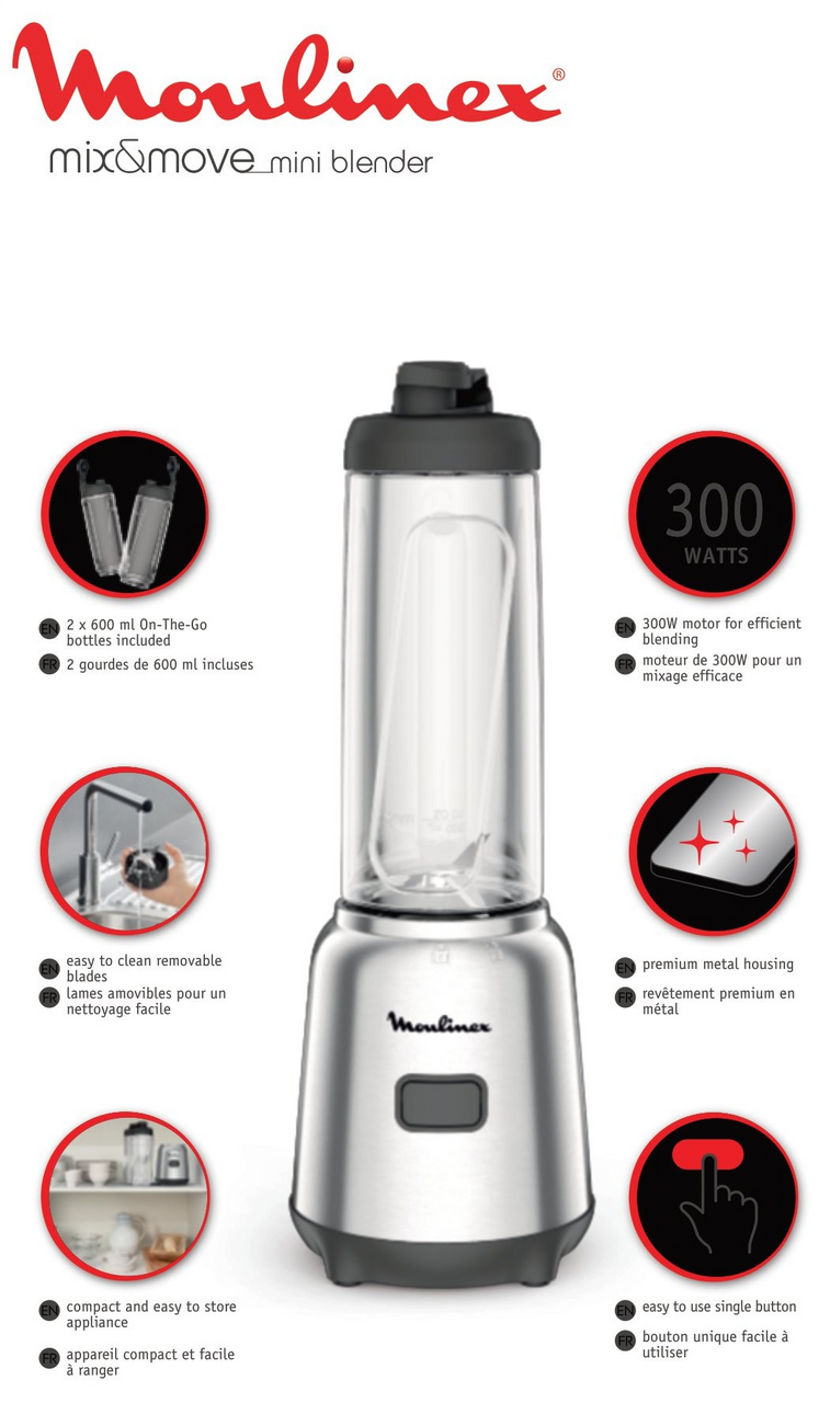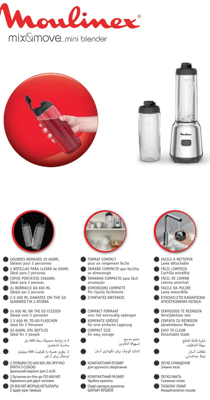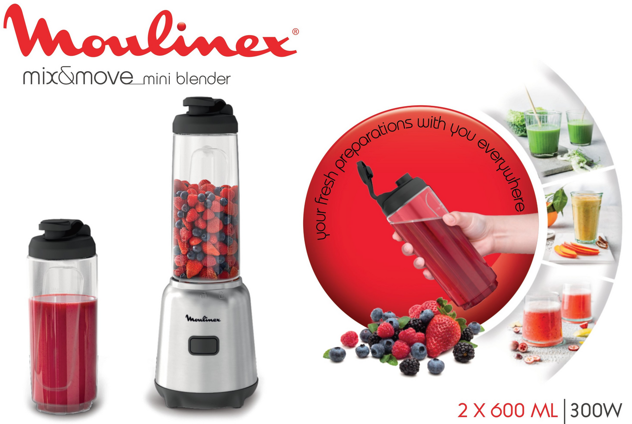 Мини-блендер Moulinex LM15FD10 обеспечивает превосходное смешивание всех ваших любимых смузи, протеиновых напитков и коктейлей, а также пару удобных бутылочек, которые можно взять с собой в дорогу, чтобы вы могли наслаждаться свежими вкусными творениями где угодно. вы хотите. Две практичные высококачественные бутылки из тритана емкостью 0,6л гарантируют вам идеальный размер, чтобы взять с собой свежеприготовленные творения.