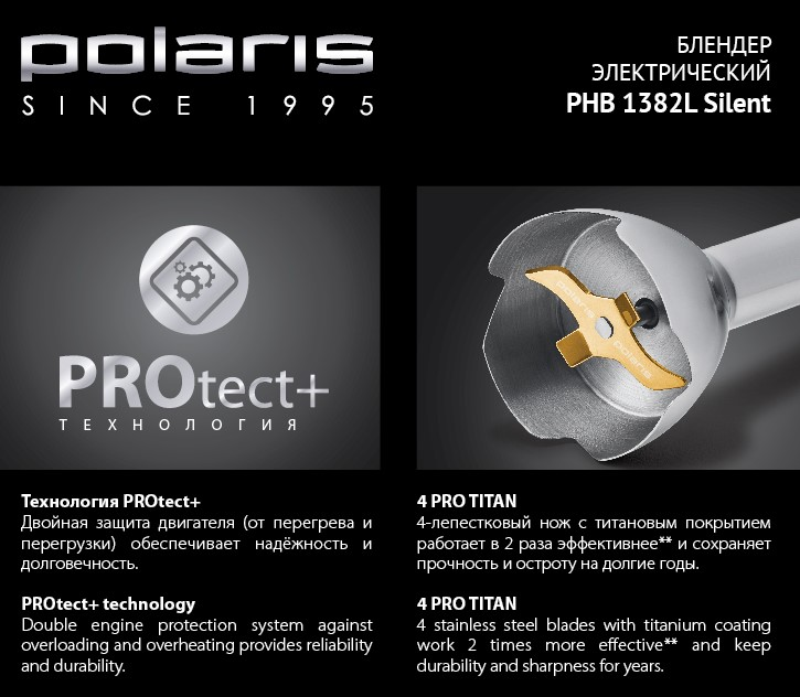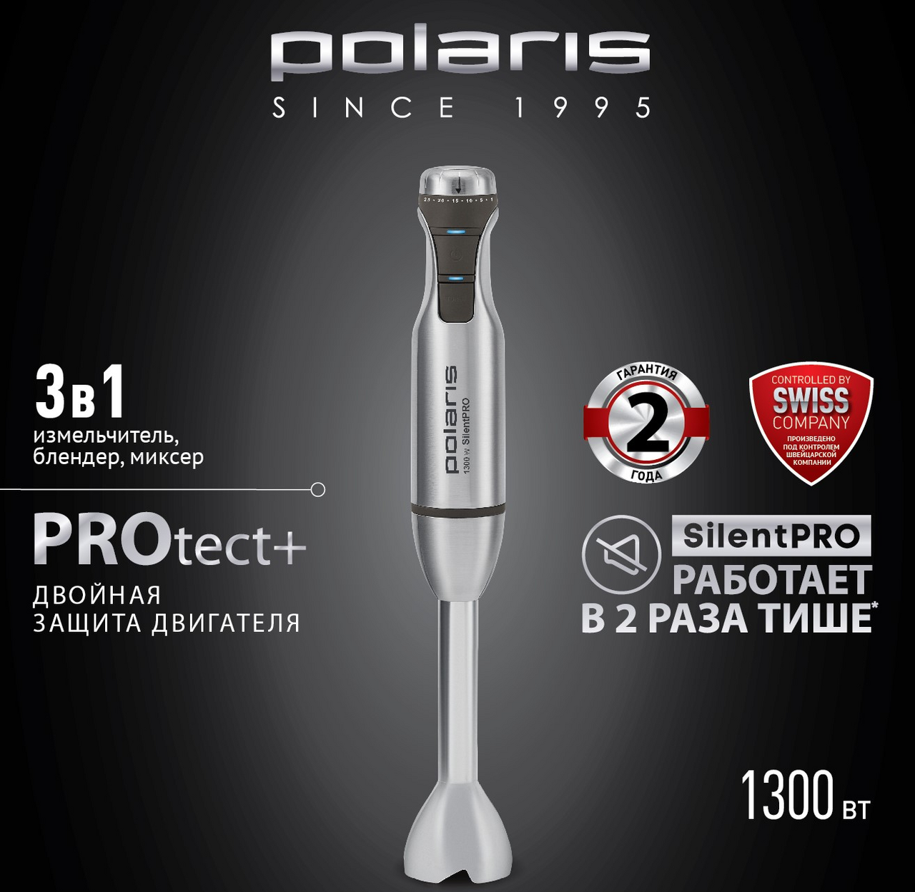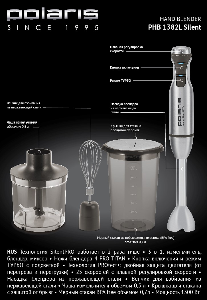 Технология SilentPRO: работает в 2 раза тише. Технология PROtect+ двойная защита двигателя (от перегрева и перегрузки) обеспечивает надежность и долговечность. Мощность: 1300Вт. 3 в 1: Измельчитель, миксер и блендер. 4-лепестковый нож с титановым покрытием работает в 2 раза эффективнее и сохраняет прочность и остроту на долгие годы. Кнопка включения и режим турбо с подсветкой. 25 скоростей с плавной регулировкой скорости. Насадка блендера и венчик из нержавеющей стали. Чаша измельчителя объемом 0,5л. Мерный стакан объемом 0,7л. Удобен в применении и очиcтке. Станет одним из лучших приобретений для кухни человека, который любит готовить. Максимальная мощность (1300Вт) сочетается с возможностью регулировать скорость вращения насадок на 25 уровнях. Прочный и приятный на ощупь корпус серебристого цвета изготовлен из пластика и металла. Комплект насадок, состоящий из венчика, измельчителя и блендера, позволяет прибору смешивать, шинковать и взбивать всевозможные ингредиенты. Все приспособления изготовлены из нержавеющей стали. При необходимости форсировать работу и справиться с твердым продуктом необходимо ненадолго активировать турборежим. Одно из больших преимуществ модели перед прочими - ее тихая работа, обусловленная применением технологии SilentPro. Чаша измельчителя блендера Polaris PHB 1382L Silent обладает объемом 0.5л и герметично закрывается на время работы. Высокая эффективность, привлекательный дизайн и компактная разборная конструкция – главные достоинства модели.