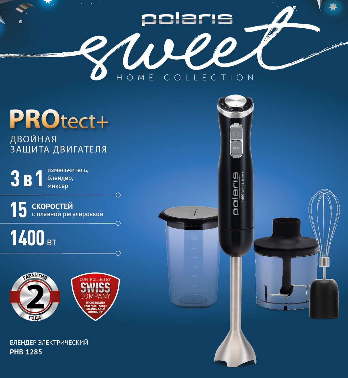 Погру��ной блендер Polaris PHB 1285 - компактный и многофункциональный прибор 3 в 1: измельчитель, миксер, блендер. Ножи блендера PRO Blade особой формы из нержавеющей стали обеспечивают эффективное измельчение и смешивание. Мощность 1400Вт. Технология PROtect+ (защита двигателя от перегрева и перегрузки) обеспечивает надежность и долговечность. Скоростной режим Турбо. Низкий уровень шума. Венчик для взбивания из нержавеющей стали. Чаша измельчителя объемом 0,5л. Мерный стакан (BPA free) с крышкой с защитой от брызг объемом 0,7л в комплекте. Эргономичная форма ручки. Удобен в применении и очистке. Гарантия 2 года.