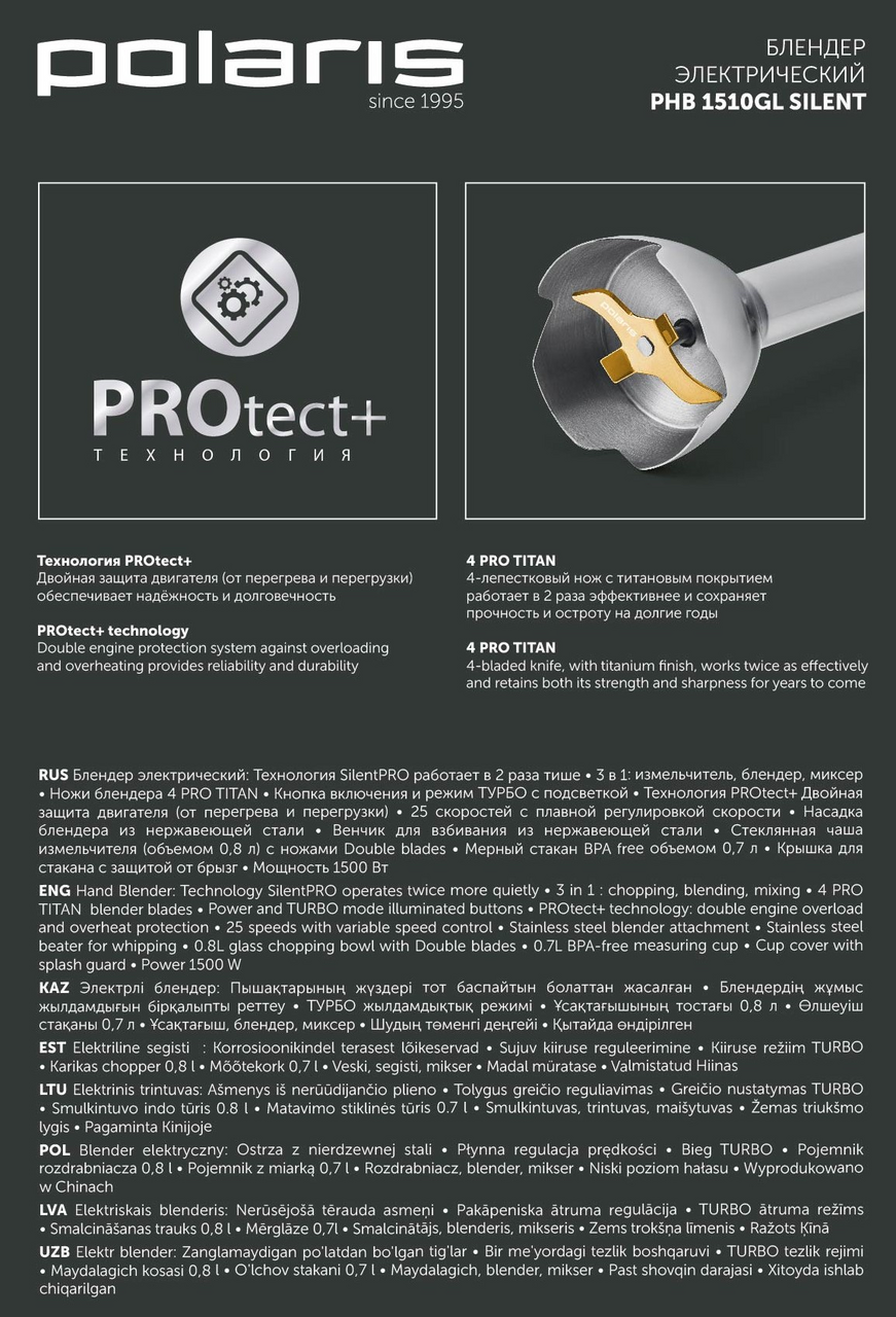Погружной блендер Polaris PHB 1510GL Silent - компактный и многофункциональный прибор, который позволит решить даже сложные кулинарные задачи без особого шума.Работает в 2 раза тише в сравнении с блендерами Polaris старого поколения благодаря технологии SilentPro. Выделяется высокой мощностью 1500Вт и комплектацией 3 в 1: блендер, миксер и измельчитель. Также в наборе вместительный мерный стакан 0,7л из небьющегося пластика (BPA free) с защитной крышкой от брызг. 4-лепестковый нож блендера 4 Pro Titan с титановым покрытием сохранит остроту и прочность на долгие годы. Чаша измельчителя выполнена из стекла и оснащена ножами Double blades, объем 0,8л. Для эффективной работы предусмотрено 25 скоростей с плавной регулировкой и режим Турбо, которые помогут добиться необходимой консистенции. Для защиты двигателя от перегрузки и перегрева предусмотрена технология Protect+. Она продлевает срок службы двигателя и предотвращает его выход из строя. Гарантия 3 года.