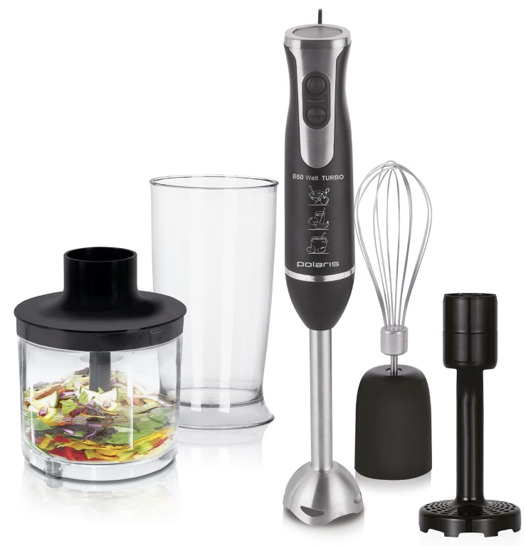 Блендер POLARIS PHB 0852* погружной мощность 850 Вт количество скоростей 2 скоростной режим турбо насадка для картофельного пюре венчик для взбивания чаша измельчителя обьемом 0,5 мерный стаканчик 700мл