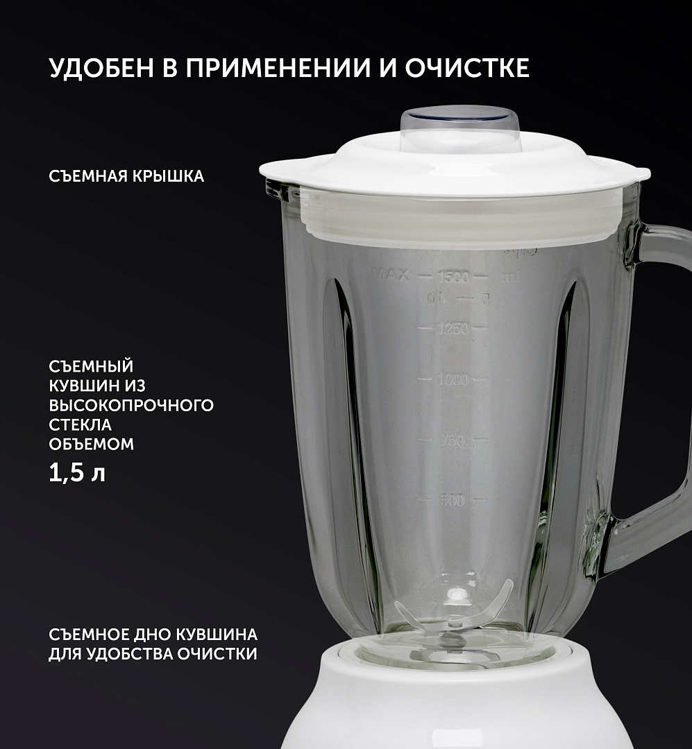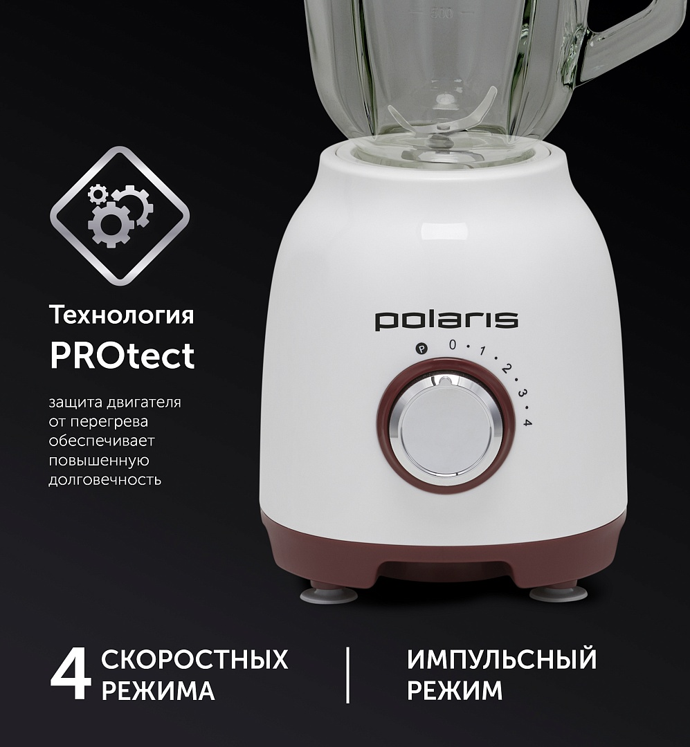 Технология PROtect - Защита двигателя от перегрева обеспечивает повышенную долговечность.Съемный кувшин из высокопрочного стекла объемом 1,5 л.Двусторонняя шкала уровня наполнения.4 скоростных режима.Импульсный режим.Стальной нож с 4 лезвиями.Специальное отверстие в крышке для добавления ингредиентов в процессе работы.