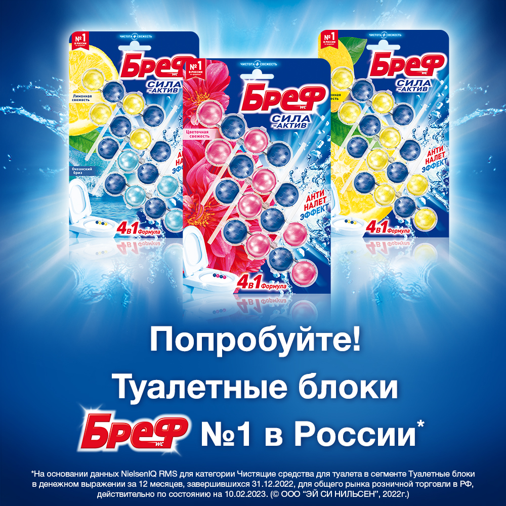 Бреф Сила-Актив с антиналет эффект – подвесной туалетный блок с формулой против известкового налета. Активная формула с антиналет эффектом действует в 4 направлениях: образует очищающую пену, которая обеспечивает гигиеническую чистоту; предотвращает образование известкового налета; помогает предотвратить повторное загрязнение; придает туалетной комнате свежий цветочный аромат после каждого смывания. Бреф Сила-Актив придает антиналет эффект при каждом смывании.