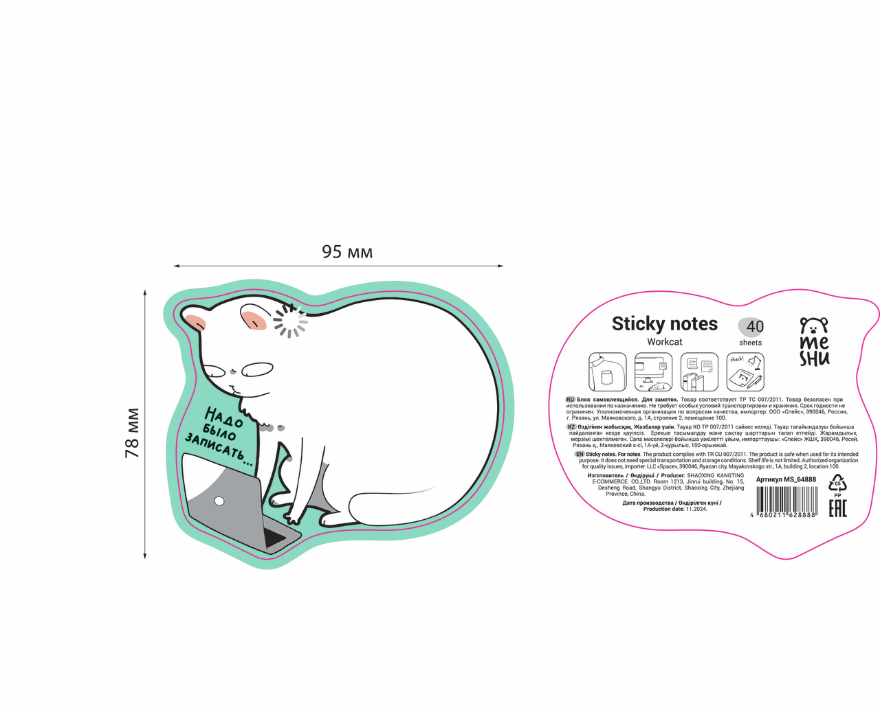 Самоклеящийся бумажный блок Meshu Workcat подходит для того, чтобы записывать повседневные и рабочие задачи, фиксировать идеи и оставлять напоминания. Фигурные стикеры с милым дизайном также помогут оформить тематические страницы в ежедневнике. Блок состоит из 40 листов. Он представлен в трёх вариантах дизайна. Плотность бумаги составляет 80г/м2. Блок упакован в индивидуальный пакет с европодвесом.