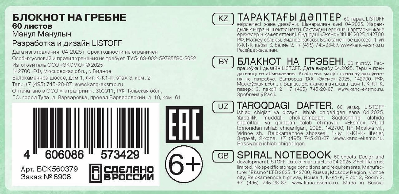 Блокнот Listoff А5 формата на гребне от компании Эксмо отлично подойдет для личных записей, телефонов друзей, никнеймов в соцсетях, коллекции шуток и приколов, а также заветных секретов. Красочная обложка с милыми персонажами подарит позитивное настроение с первого взгляда. Внутри 60 листов в клетку плотностью 60гр/м2. Рекомендовано детям 6+.