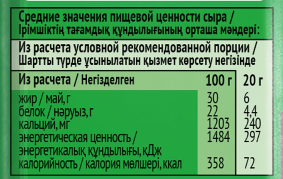 Молоко нормализованное пастеризованное, соль (соль, агент антислеживающий ферроцианид калия), уплотнитель кальция хлорид, закваска на основе мезофильных и термофильных молочнокислых микроорганизмов, консервант нитрат натрия, молокосвертывающий ферментный препарат микробного происхождения, краситель аннато (аннато, регулятор кислотности гидроксид калия).