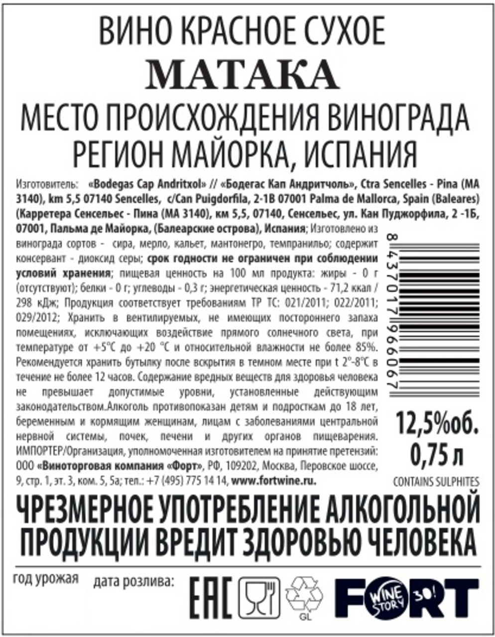 Вино BODEGA CAP ANDRITXOL Mataca красное сухое, 0,75 л увидело свет в жаркой и темпераментной Испании (Майорка). Мягкий климат и щедрая почва дарят урожаю уникальные качества для силы и насыщенности будущего напитка. Истинное удовольствие получат ценители от цвета, аромата и собственно вкуса при дегустации. Для начала непременно стоит полюбоваться на то, как бокал медленно наполняется драгоценным рубиновым цветом с гранатовыми отблесками. Затем вдохнуть щедрый и богатый аромат, в котором угадываются сочность садовых фруктов и сладость ягод, пикантность пряностей. Сам вкус покоряет своей теплотой и идеальным балансом кислотности, он вторит аромату и оставляет приятное продолжительное послевкусие. Традиционно такой напиток отлично сочетается с мясом, особенно ж��ренным на гриле, травами, мясным ассорти, оригинальной сырной тарелкой со зрелыми сортами сыров. Рекомендуется подавать к столу, слегка охладив – до 16-18С. Крепость напитка составляет 12%. Приобрести Вино BODEGA CAP ANDRITXOL Mataca красное сухое, 0,75 л можно в торговом центре METRO. Меры предосторожности: алкоголь противопоказан детям и подросткам до восемнадцати лет, беременным и кормящим женщинам, лицам с заболеваниями центральной нервной системы, почек, печени и других органов пищеварения. Чрезмерное употребление алкоголя вредит вашему здоровью.