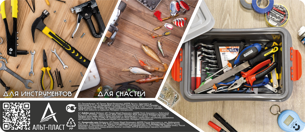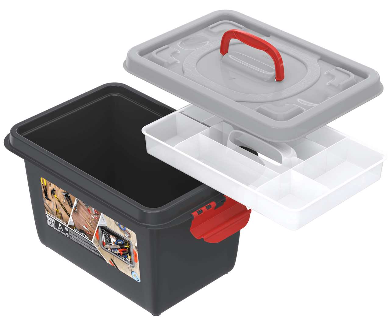 Универсальный бокс с вкладышем 10л. Предназначен для инструментов и рыболовных снастей. У бокса имеются закрывающиеся защелки, удобная ручка на крышке, вкладыш разделен на секции. Бокс помогает навести порядок и рассортировать мелкие предметы, разложить болты, шурупы и саморезы легко во вкладыше, они не потеряются и у каждой мелочи будет своё место. Размер бокса: 35.924.221,1 см (Д*Ш*В) Цвет: серый. Максимальная нагрузка -15кг, общий объем в литрах 10л.