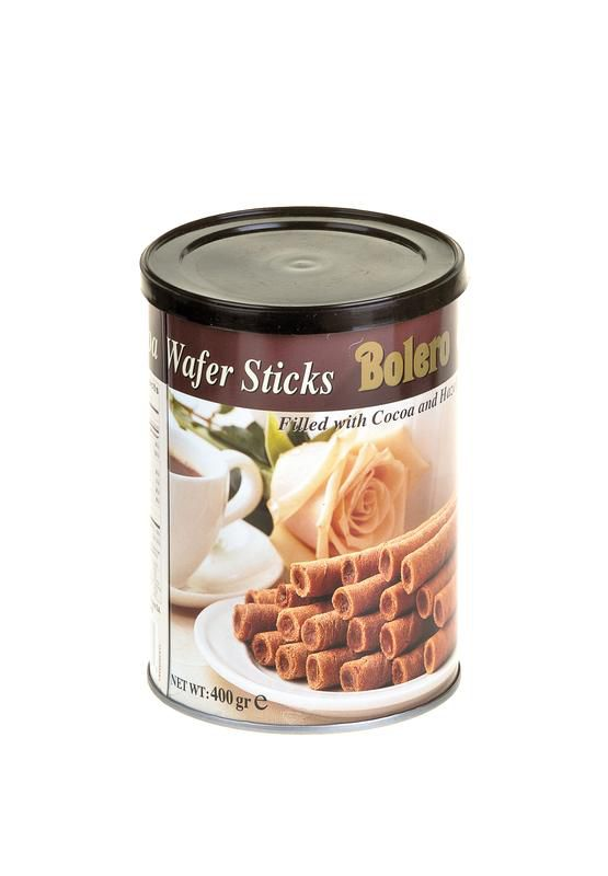 Вафельные трубочки Bolero шоколадные с фундуком 400г. Состав: сахар, пшеничная мука, растительные жиры (пальмовое масло), обезжиренное сухое молоко, сухая сыворотка, кукурузный крахмал, лесной орех (1,2%), обезжиренное какао-порошок (3,2%), эмульгатор: соевый лецитин, краситель: цвет карамели, сироп глюкозы, порошок яичного желтка, натуральный ароматизатор: ваниль. Энергетическая ценность: 475 кКалл. Срок годности: 18 месяцев.