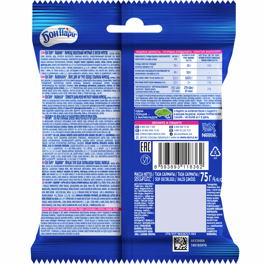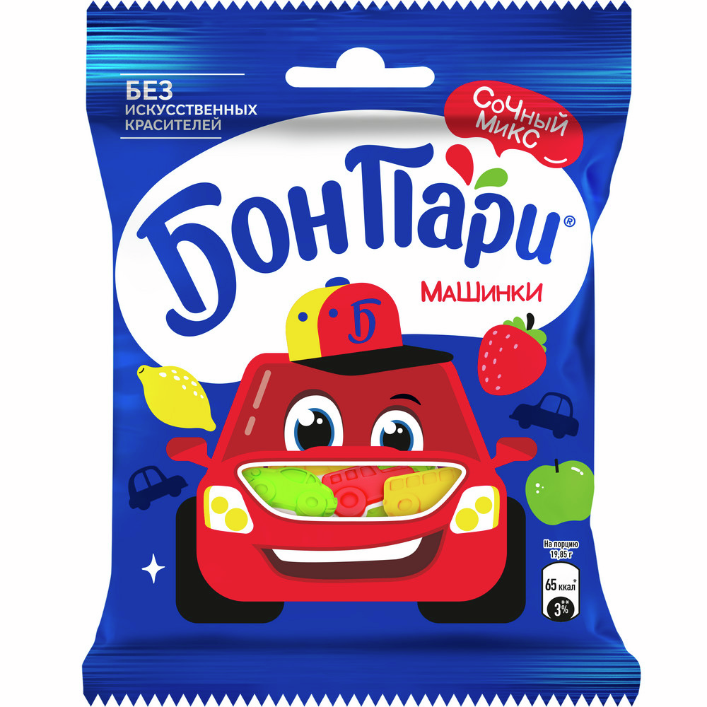 Двухслойный мармелад в форме забавных машинок от бренда номер 1. Яркий вкус фруктов: яблоко, апельсин, клубника, лимон и нежная белая пена. Без искусственных красителей. Побалуйте себя сочным миксом! Прошло более 40 лет, с момента появления первой конфеты Бон Пари, но до сих пор восхитительный вкус продолжает привлекать новых покупателей и приносить радость в повседневную жизнь.