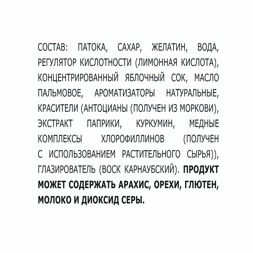 Патока, сахар, желатин, вода, регулятор кислотности (лимонная кислота), концентрированный яблочный сок, масло пальмовое, натуральные ароматизаторы, красители (антоцианы (получен из моркови), куркумин, медные комплексы хлорофиллинов (получен с использованием растительного сырья), экстракт паприки), глазирователь (воск карнаубский). Продукт может содержать молоко, глютен и диоксид серы.