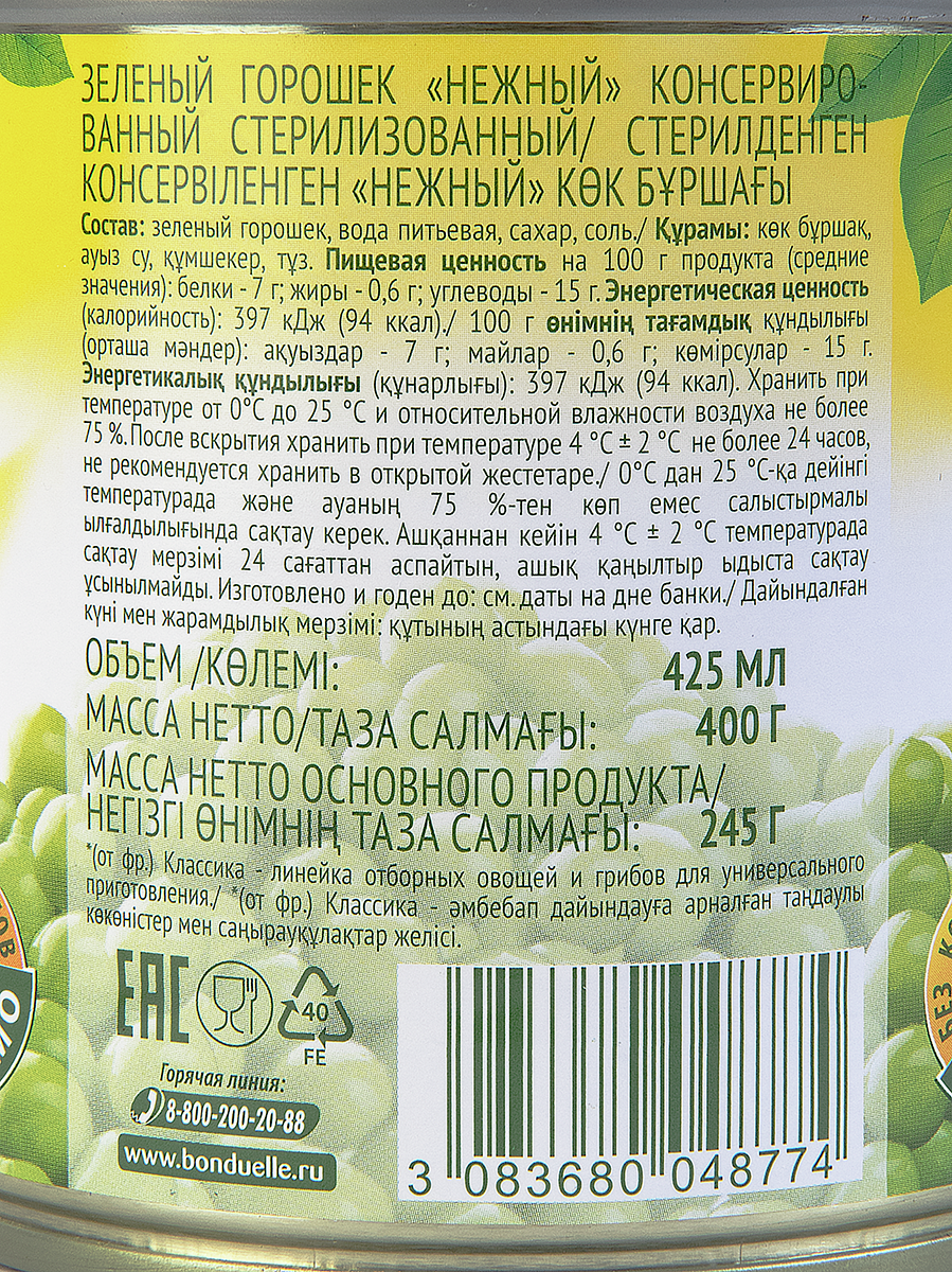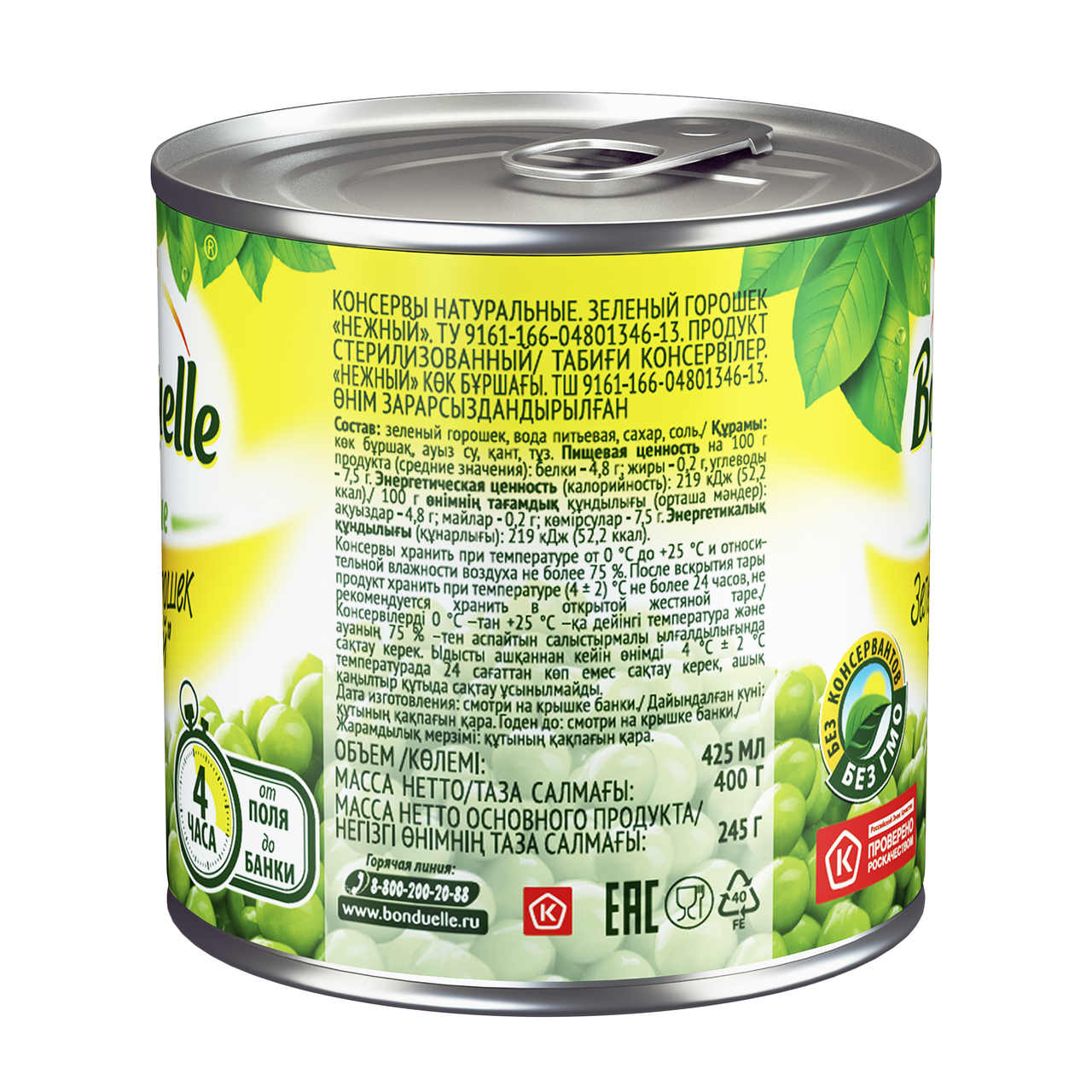 Нежнейший и сладкий зеленый горошек непревзойденного качества тщательно отбирается, прежде чем попасть в банку. Только у Бондюэль процесс от сбора с грядки до упаковки проходит всего за 4 часа, поэтому на вашем столе всегда самый лучший горошек мозговых сортов, в котором содержится меньше крахмала, больше витаминов и яркого вкуса.