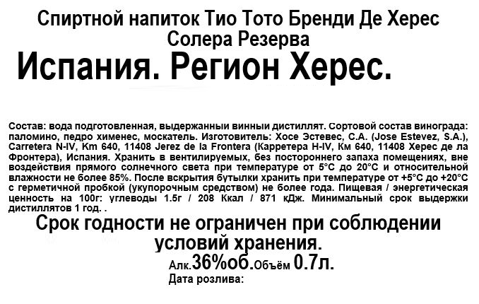 Бренди Tio Toto De Jerez Solera Reserva, 0.7л