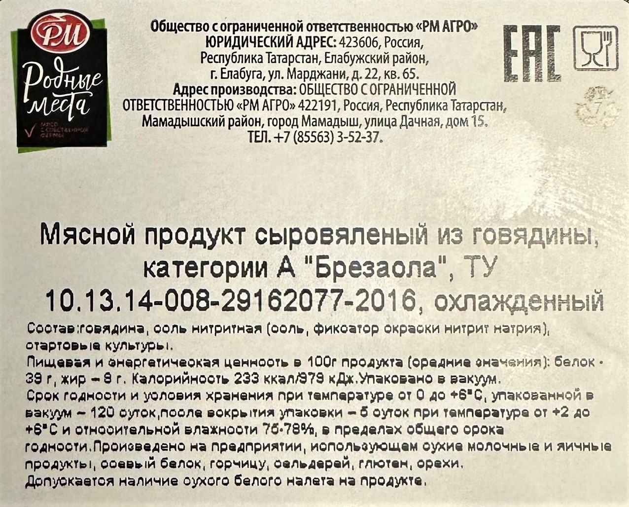 Брезаола из говядины Родные места сыровяленая, ~200г