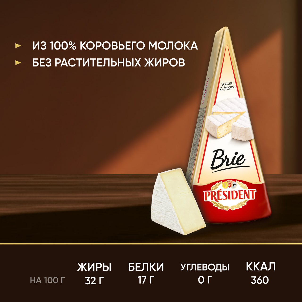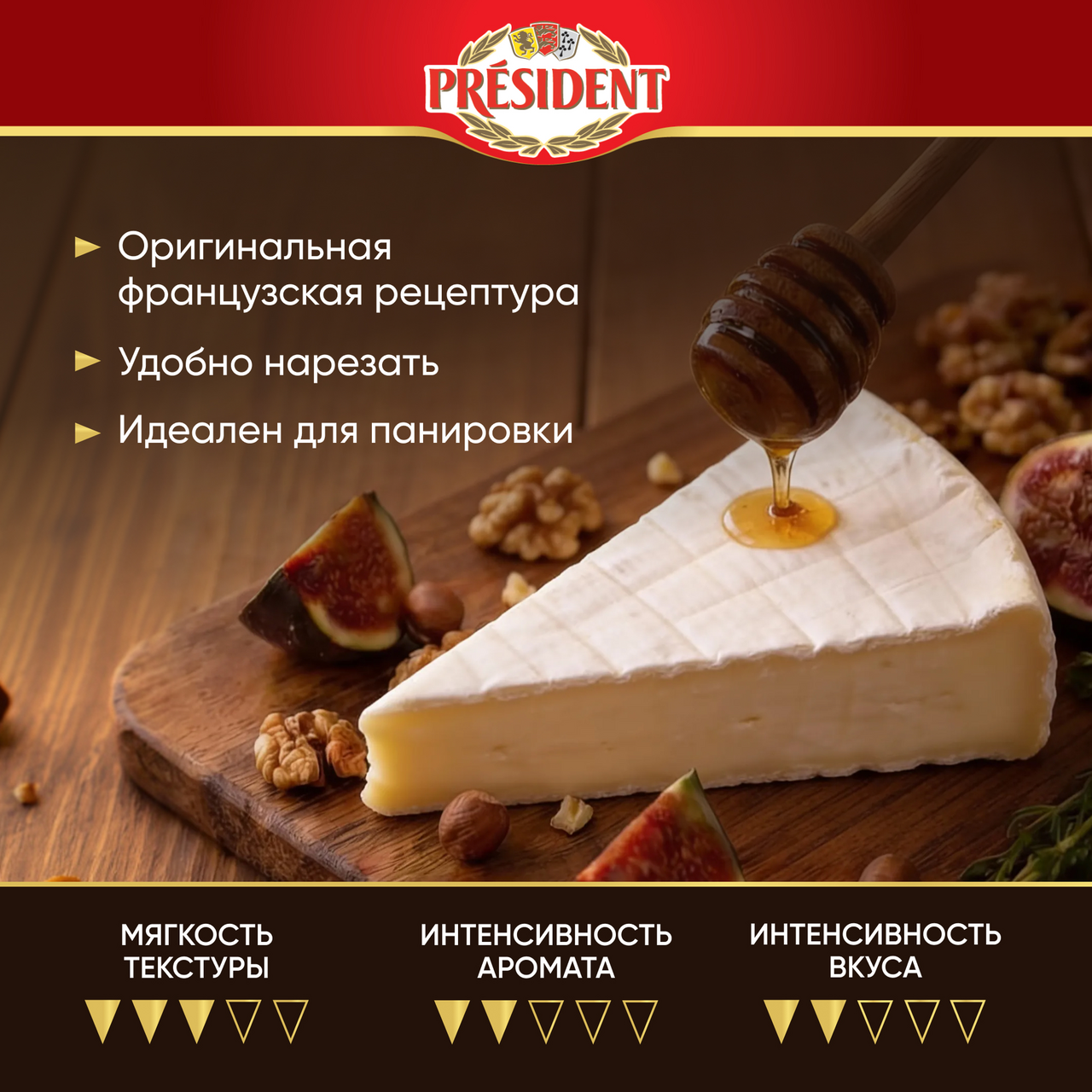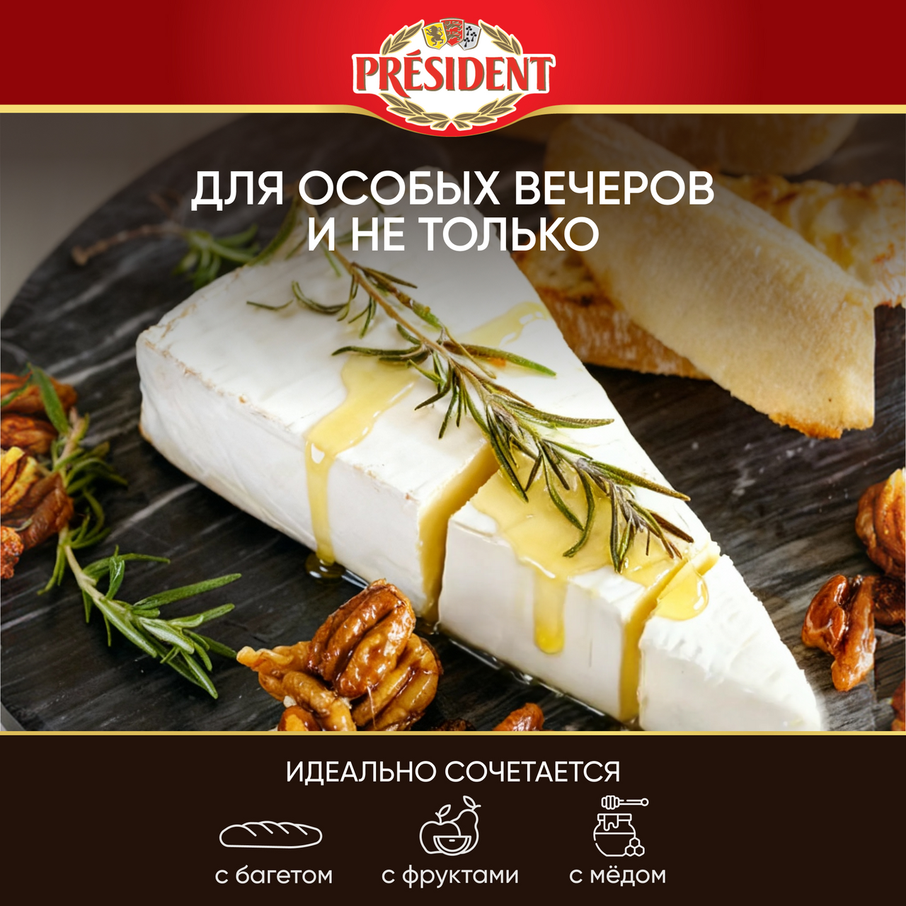 Сыр мягкий President Brie с белой плесенью обладает нежнейшим сливочным вкусом и покрыт белой бархатистой корочкой. Это один из самых популярных мягких сыров в мире, без которого не обходится ни одна сырная тарелка! Сыр бри можно сочетать с фруктами, медом, темным шоколадом или наслаждаться им без дополнений. Сыр с плесенью лучше подавать комнатной температуры, чтобы он раскрыл все грани вкуса и аромата. Мягкий сыр также можно запечь вместе с медом и орехами или приготовить с ним легкие салаты и закуски к вину: канапе или тартинки. История бренда President началась в 1968 году во Франции, а сейчас наши продукты являются неотъемлемой частью жизни миллионов людей по всему миру. President — это всегда высочайшее качество и безупречный вкус, а также искусство получать удовольствие от жизни!