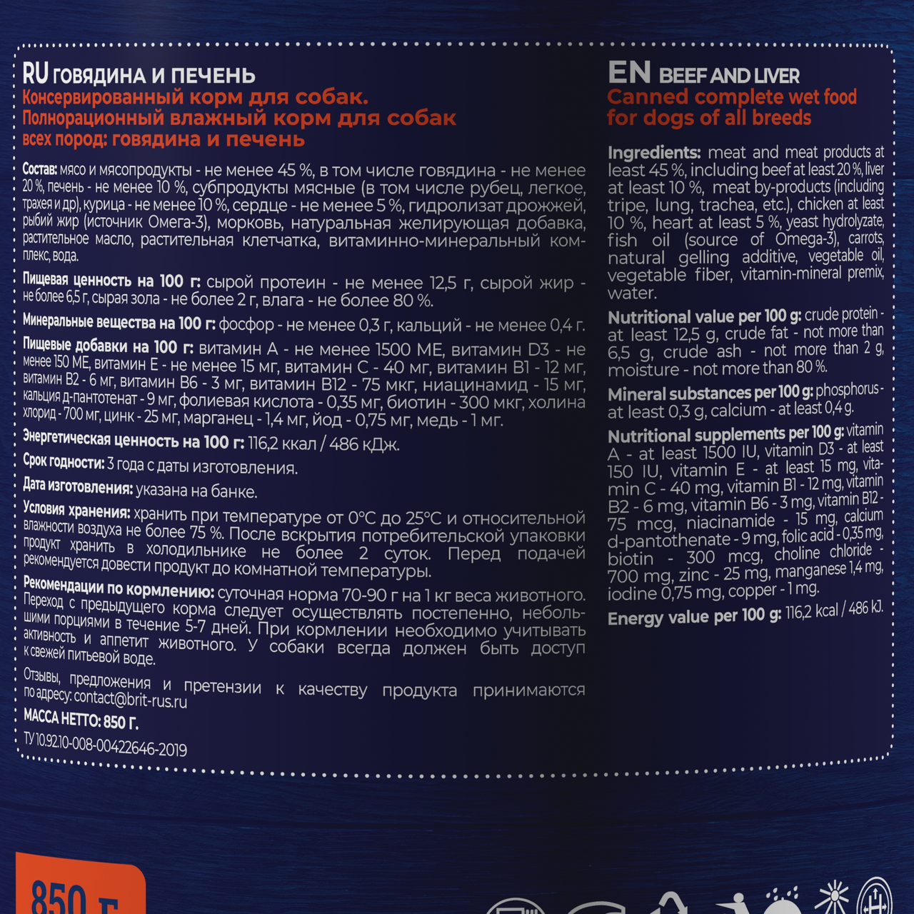 Консервы для собак Brit говядина и печень, 850г представляют собой влажный сбалансированный корм, обогащенный витаминами. Мягкие сочные кусочки в желирующей смеси нравятся домашним питомцам и являются источником полезных веществ, необходимых для нормальной работы их организма. Говядина легко усваивается и служит источником пищевых волокон. Печень полезна, в ней содержится железо, которое участвует в обменных процессах и требуется органам кроветворения. Витаминно-минеральный комплекс требуется для нормальной работы всех органов и систем. Кальций нужен опорно-двигательному аппарату и зубам. Злаки улучшают работу пищеварительной системы. Состав корма сбалансирован. Он поможет домашнему питомцу оставаться здоровым и активным.