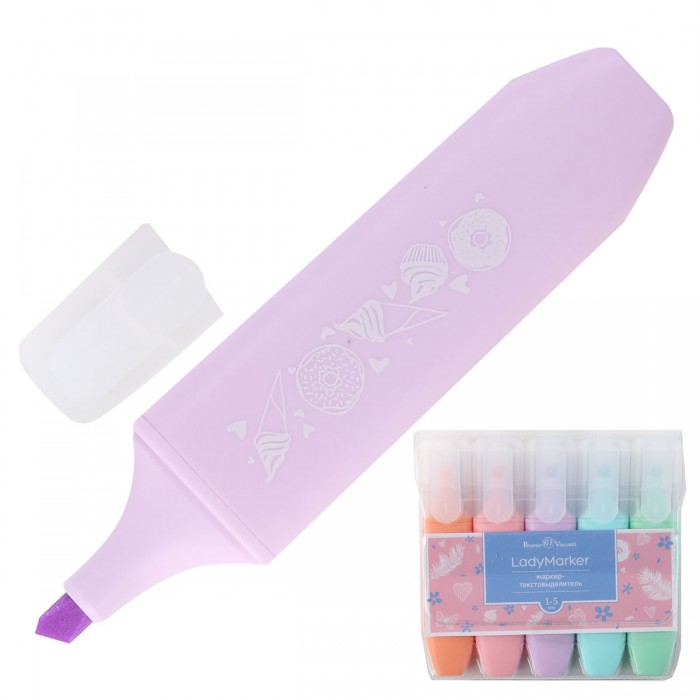 Текстовыделитель BRUNO VISCONTI Lady Marker, 5 цветов представлен в удобной и эргономичной упаковке из ПВХ с европодвесом. В наборе 5 самых актуальных цветов. Толщина скошенного наконечника 1-5 мм позволяет с легкостью проводить как тонкие ровные линии, так и выделять сразу весь текст. Высококачественный флуоресцентные чернила на водной основе прекрасно наносятся на бумагу любого типа (офисную, факсовую и даже фотобумагу), быстро высыхают и не размазываются. Такой набор станет незаменимым помощником в учебном процессе и во время подготовки к экзаменам — вы сможете выделять ключевые моменты в тексте и возвращаться к ним во время повторения материала. Текстовыделители актуальны как для школьников, так и для студентов, творческих людей и офисных сотрудников. Пользоваться такими маркерами вы сможете долгое время — они не засыхают, сохраняя насыщенность цвета и четкость линий.