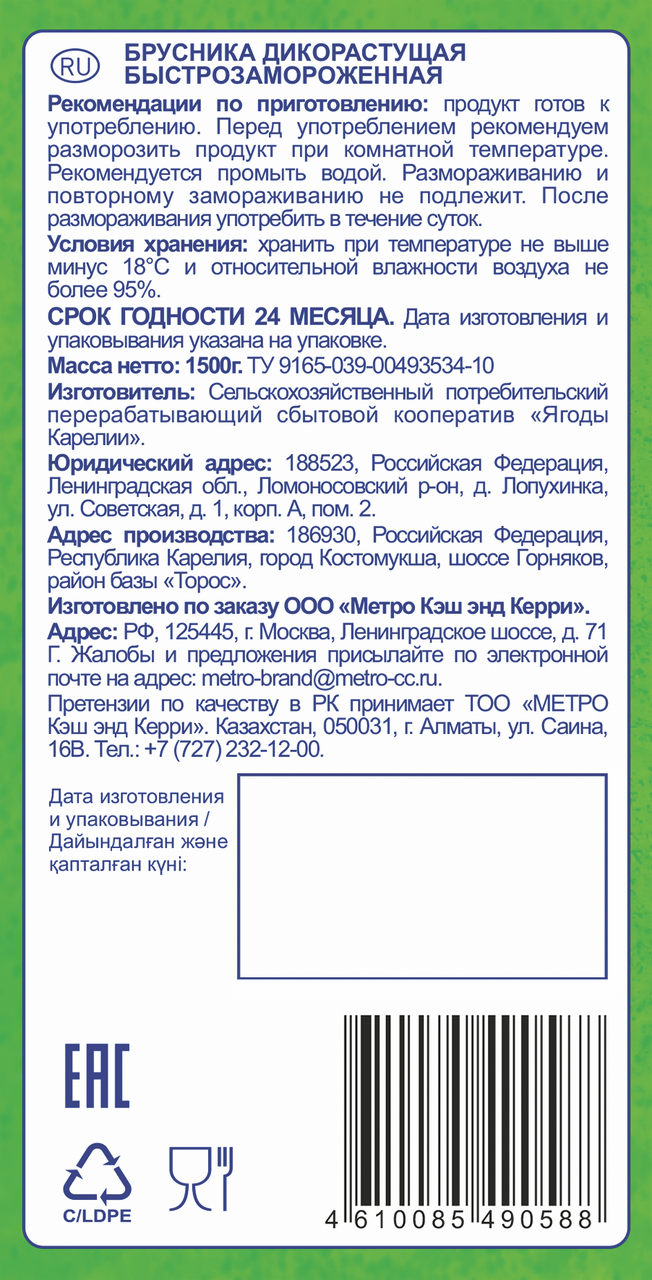 Брусника дикорастущая, 1500 г пополнит организм необходимыми витаминами и минеральными веществами. Это кисло-сладкая ягода с легкой терпкостью и необычным вкусом. Брусника произрастает в экологически чистых районах Сибири, Дальнего Востока, на Кавказе, сохраняя в себе пользу от самой природы. Это источник витамина А и С, нескольких типов кислот и дубильных веществ. Ягода активно ис��ользуется в народной медицине при различных болезнях, а также для укрепления иммунитета. Из нее отжимают сок, готовят компоты, соусы, варенье. Не менее интересна брусника как начинка для выпечки. При правильном хранении она сохраняет все полезные вещества, во время упаковки подвергаясь шоковой заморозке. После размораживания ягода хранению и повторной заморозке не подлежит.