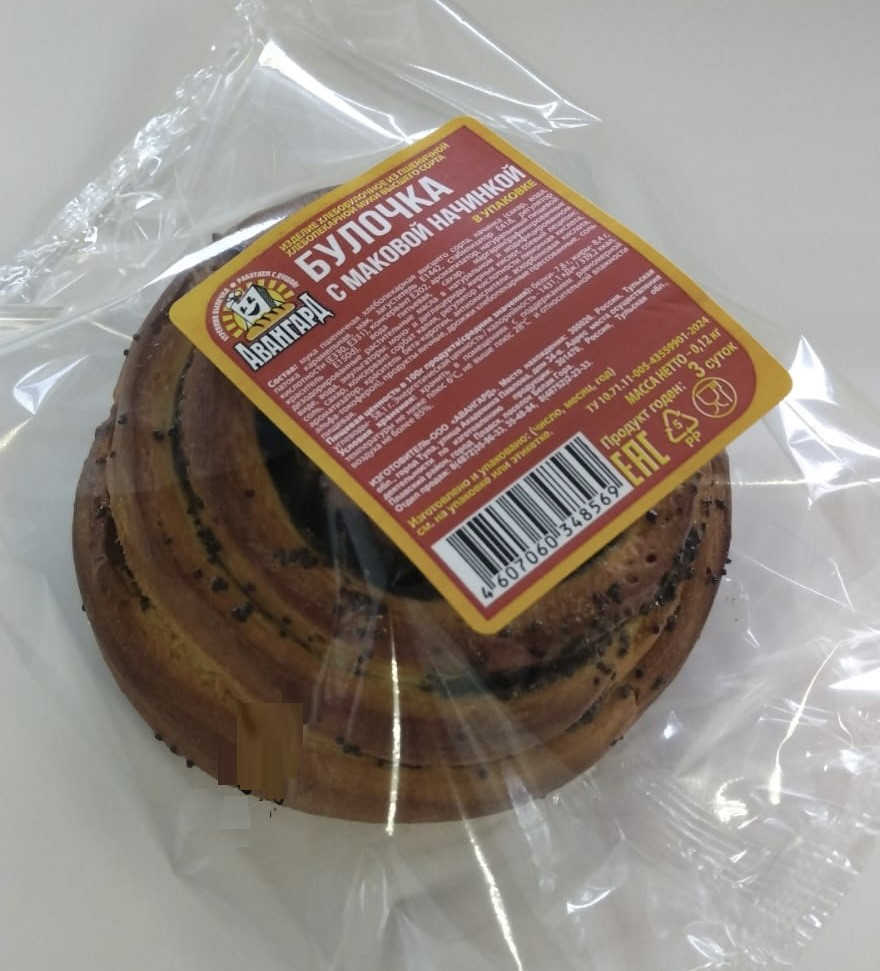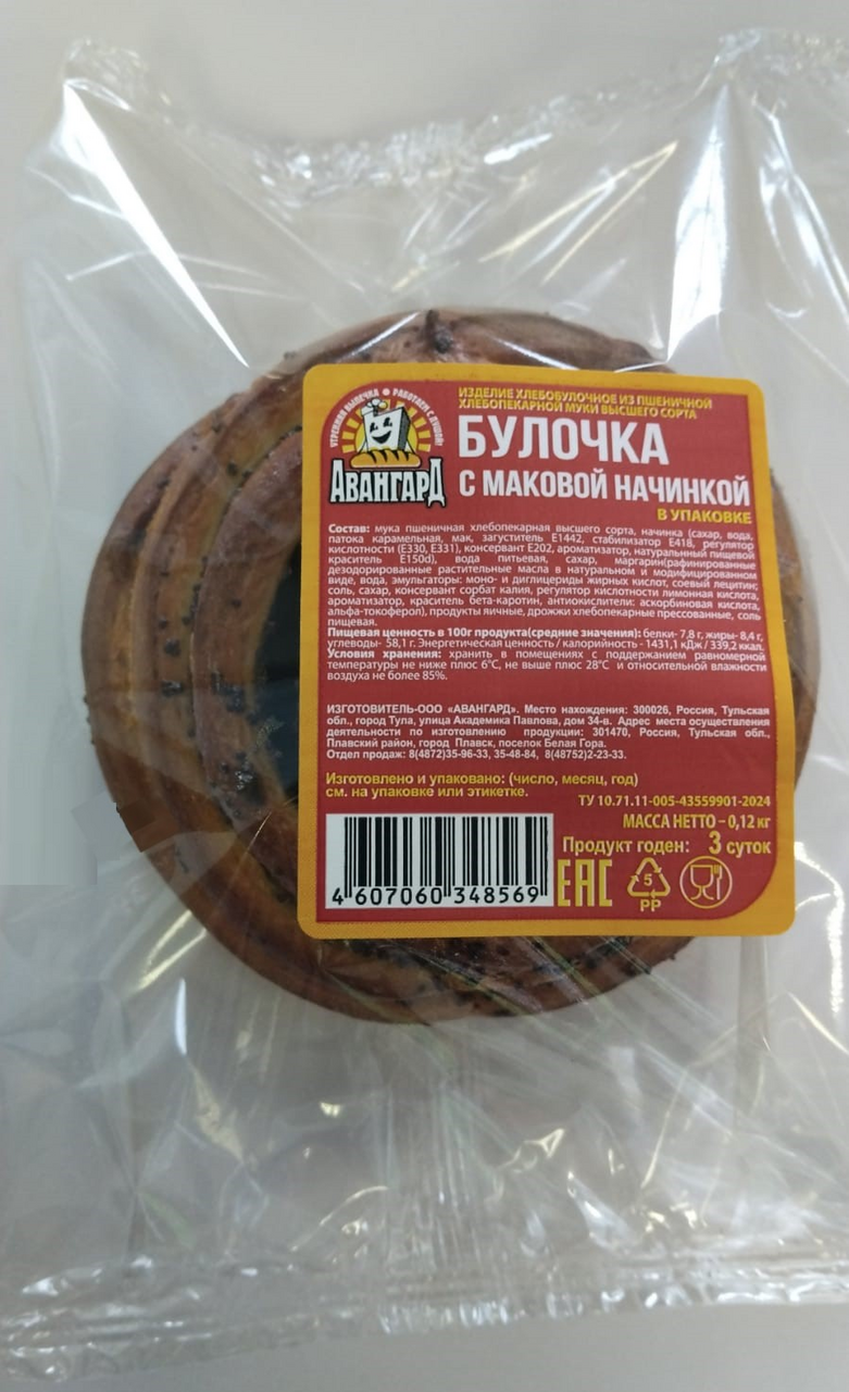 Мука пшеничная хлебопекарная высшего сорта, начинка (сахар, вода, патока карамельная, мак, загуститель Е1442, стабилизатор 6418, регулятор кислотности (Е330, Е331), консервант Е202, ароматизатор, натуральный пищевой краситель E150d), вода питьевая, сахар, маргарин рафинированные дезодорированные растительные масла в натуральном и модифицированном виде, вода, эмульгаторы: моно- и диглицериды жирных кислот, соевый лецитин, соль, сахар, консервант сорбат калия, регулятор кислотности лимонная кислота, ароматизатор, краситель бета-каротин, антиокислители: аскорбиновая кислота, альфа-токоферол), продукты яичные, дрожжи хлебопекарные прессованные, соль.