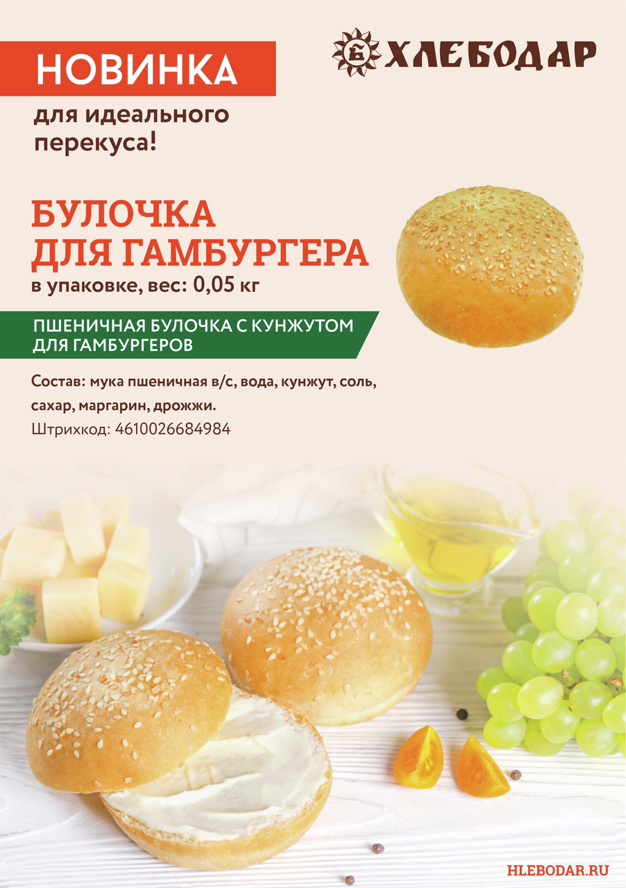 Мягкая и упругая булочка с нежным мякишем.Пшеничное хлебобулочное изделие с кунжутом. Великолепный хлебушек для быстрого приготовления сочных гамбургеров. Просто добавьте горячую котлету, соус, овощи, и сытный обед готов.