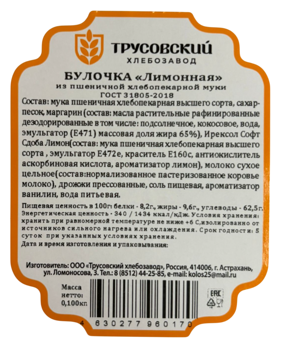 Булочка Трусовский хлебозавод лимонная, 100г