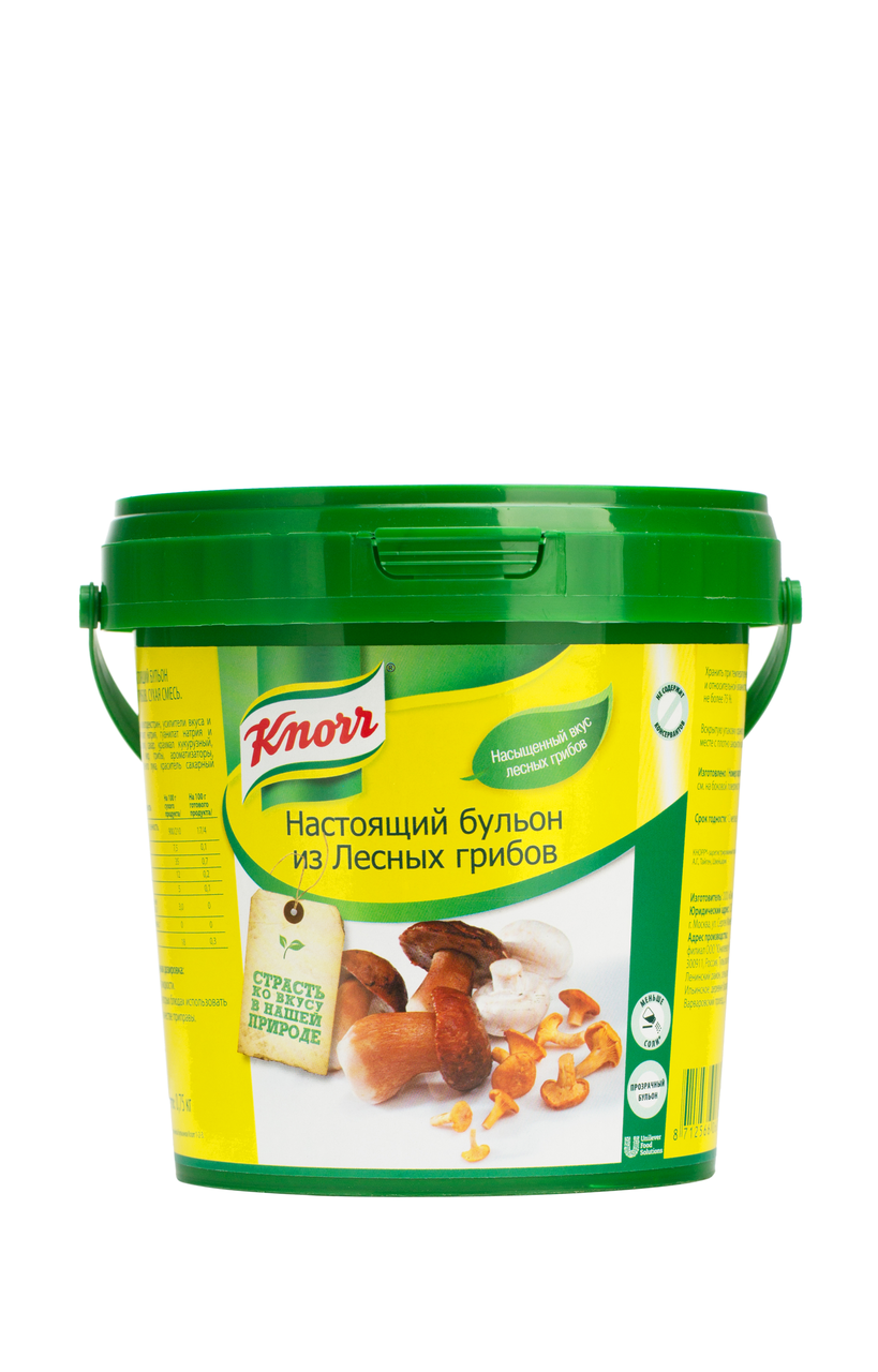 Состав короба: 1шт. Knorr Настоящий бульон из лесных грибов Сухая смесь (750г) - это прозрачный бульон без кусочков овощей и зелени. Можно использовать в качестве самостоятельного первого блюда. Прекрасная основа для супа, соуса, заливного, консоме. Состав: Соль, мальтодекстрин, усилители вкуса и аромата (глутамат натрия, гуанилат и инозинат натрия), сахар, крахмал кукурузный, растительный жир, грибы, ароматизаторы, экстракт жареного лука, краситель сахарный колер III.Срок годности 12 месяцев. Хранить при температуре не выше +20 Со и относительной влажности не более 75% с плотно закрытой крышкой. После вскрытия хранить в сухом прохладном месте с плотно закрытой крышкой до истечения срока годности. Состав короба: 6шт.