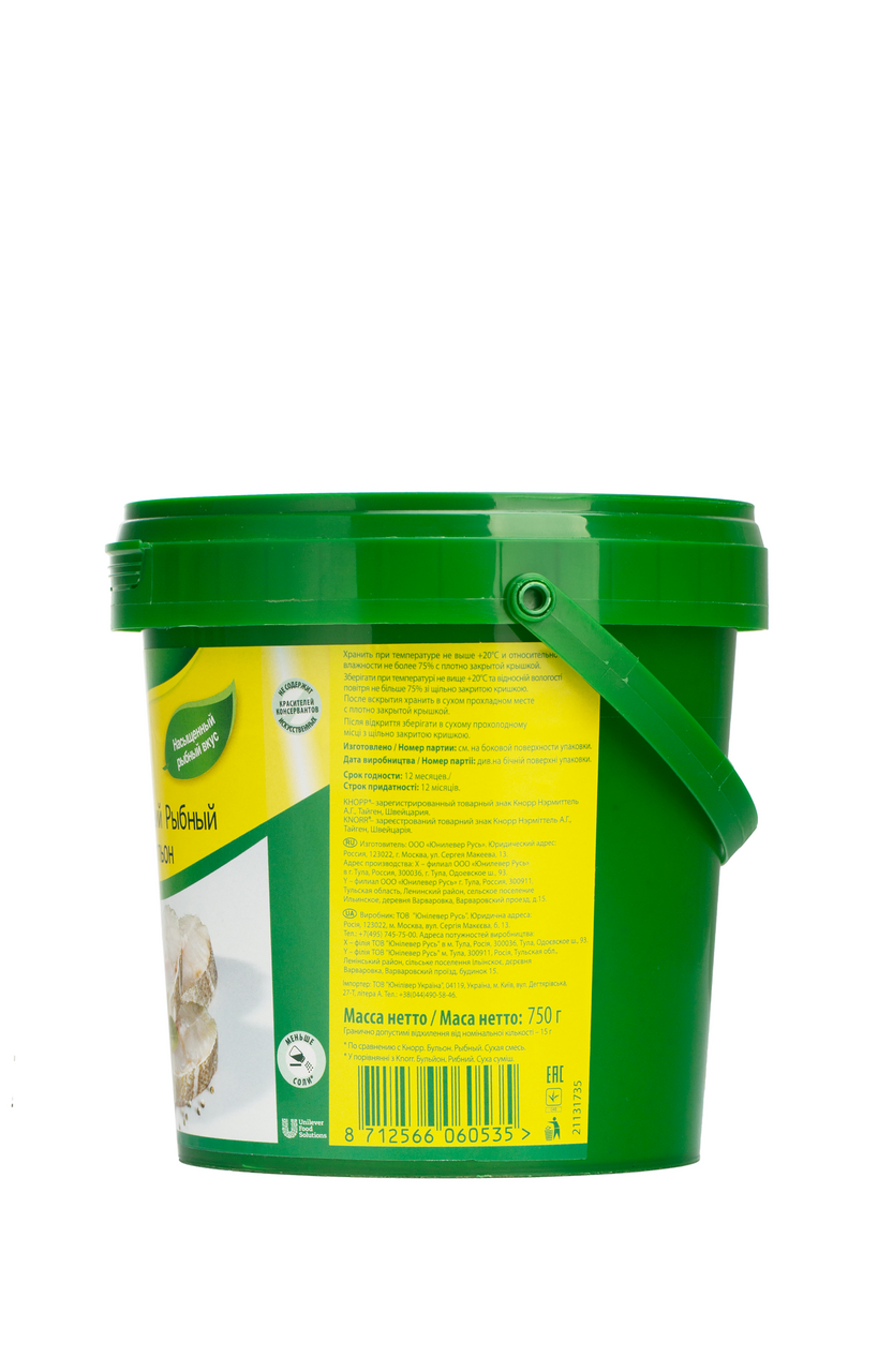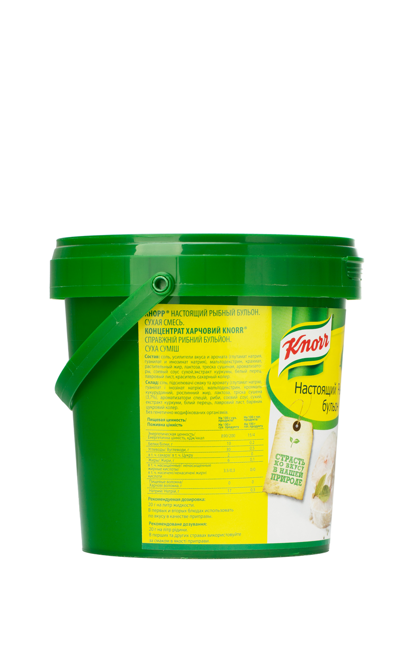 Состав короба: 1шт. Knorr Настоящий рыбный бульон Сухая смесь (750г) - это прозрачный бульон без кусочков овощей и зелени. Можно использовать в качестве самостоятельного первого блюда. Прекрасная основа для супа, соуса, заливного, консоме. Состав: Соль, усилители вкуса и аромата (глутамат натрия, гуанилат и инозинат натрия), мальтодекстрин, крахмал, растительный жир, лактоза, треска сушеная, ароматизаторы, соевый соус сухой, экстракт куркумы, белый перец, лавровый лист, краситель сахарный колер III.Срок годности 12 месяцев. Хранить при температуре не выше +20 Со и относительной влажности не более 75% с плотно закрытой крышкой. После вскрытия хранить в сухом прохладном месте с плотно закрытой крышкой до истечения срока годности. Состав короба: 6шт.