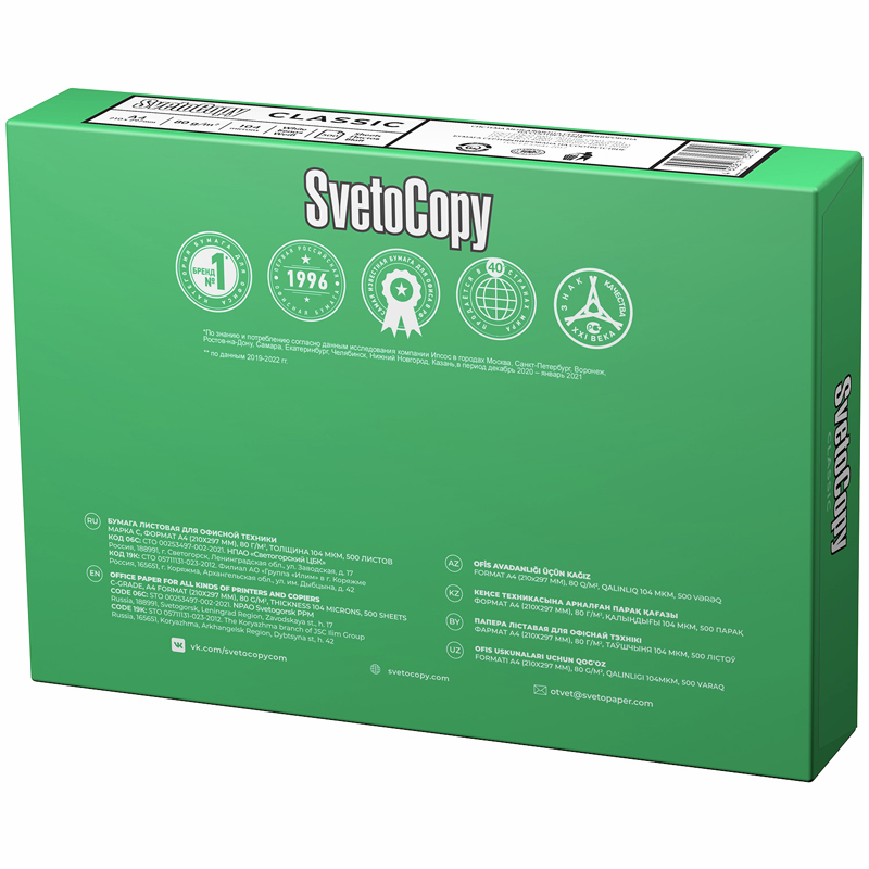 Офисная бумага Svetocopy A4 80 г/кв. м, 5 шт будет незаменима в образовательном сегменте, небольшом или крупном корпоративном учреждении, дома. Ее целесообразно использовать для распечатывания многих документов, выполнения копий, необходимых для ведения бухгалтерской или другой отчетности, в рамках подготовки к совещаниям. Вдобавок подобный вид бумаги можно использовать для изготовления модульного оригами или для записей, выполненных чернилами. Продукт бренда Svetocopy характеризуется базовым качеством исполнения класса C, оптимальными показателями прозрачности, а также стандартной плотностью. Листы бумаги не склонны к изгибам, правильно передают цвета, при белизне 146% поверхность хорошо отражает свет. С печатного листа удобно читать различную текстовую информацию, просматривать графические изображения. Канцелярский товар обеспечивает бесперебойную работу современной оргтехники. Он не станет причиной быстрого износа периферийного оборудования: МФУ, черно-белого-копира или лазерного принтера.