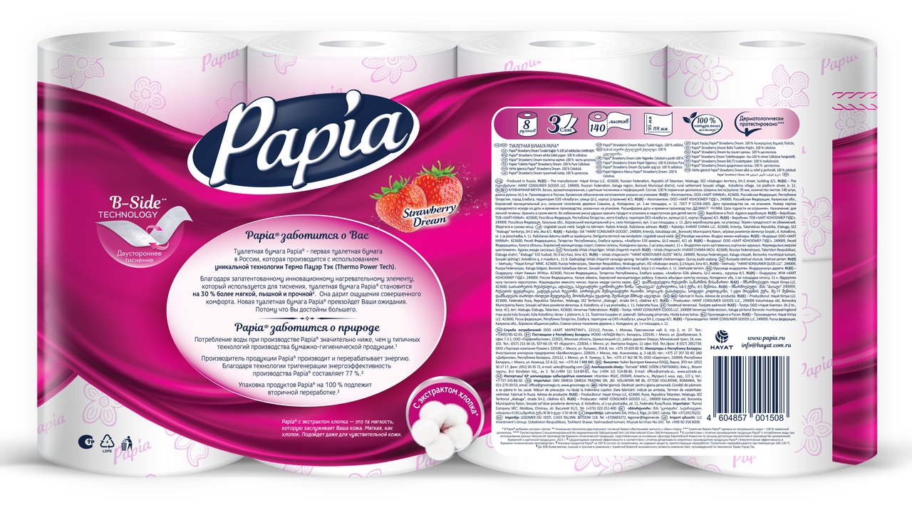 Туалетная бумага Papia Клубничная мечта 3-слойная, 8 рулонов