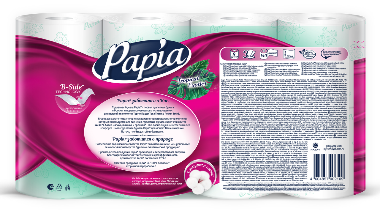 Ароматизированная трехслойная туалетная бумага Papia "Тропикал Экзотикс" с цветным тиснением и перфорацией. "Тропикал Экзотикс" – нежный цветочный аромат подарит Вам наслаждение. Уникальная технология двустороннего тиснения бумаги обеспечивает лучшую впитываемость и мягкость с обеих сторон. Теперь содержит экстракт хлопка. Обновленная Papia - выбор тех, кто всегда стремится к большему. Благодаря новой, инновационной технологии Termo Power Tech туалетная бумага теперь еще более мягкая, пышная и прочная.