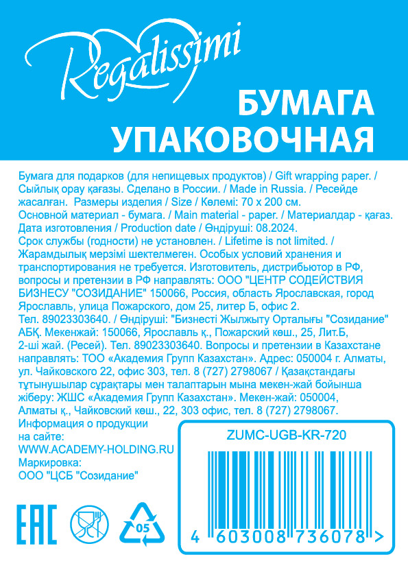 Упаковочная крафт бумага для оформления подарков, рулон в термоусадочной пленке.
