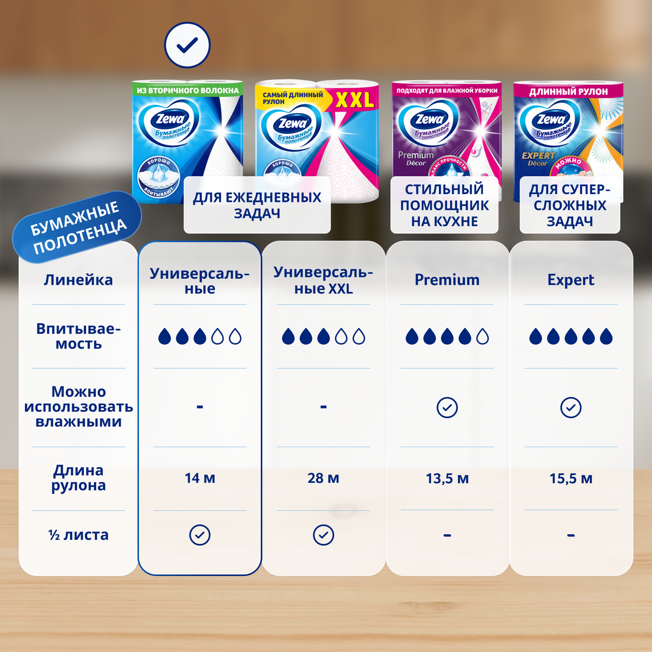 Бумажные полотенца Zewa с дополнительной перфорацией 1/2 листа позволяют экономичнее расходовать продукт и использовать половину листа при небольших загрязнениях. Бумажные полотенца Zewa - универсальный и незаменимый помощник в доме. С их помощью можно легко вытереть пролитую жидкость, отполировать до блеска стекла или посуду, очистить поверхности.