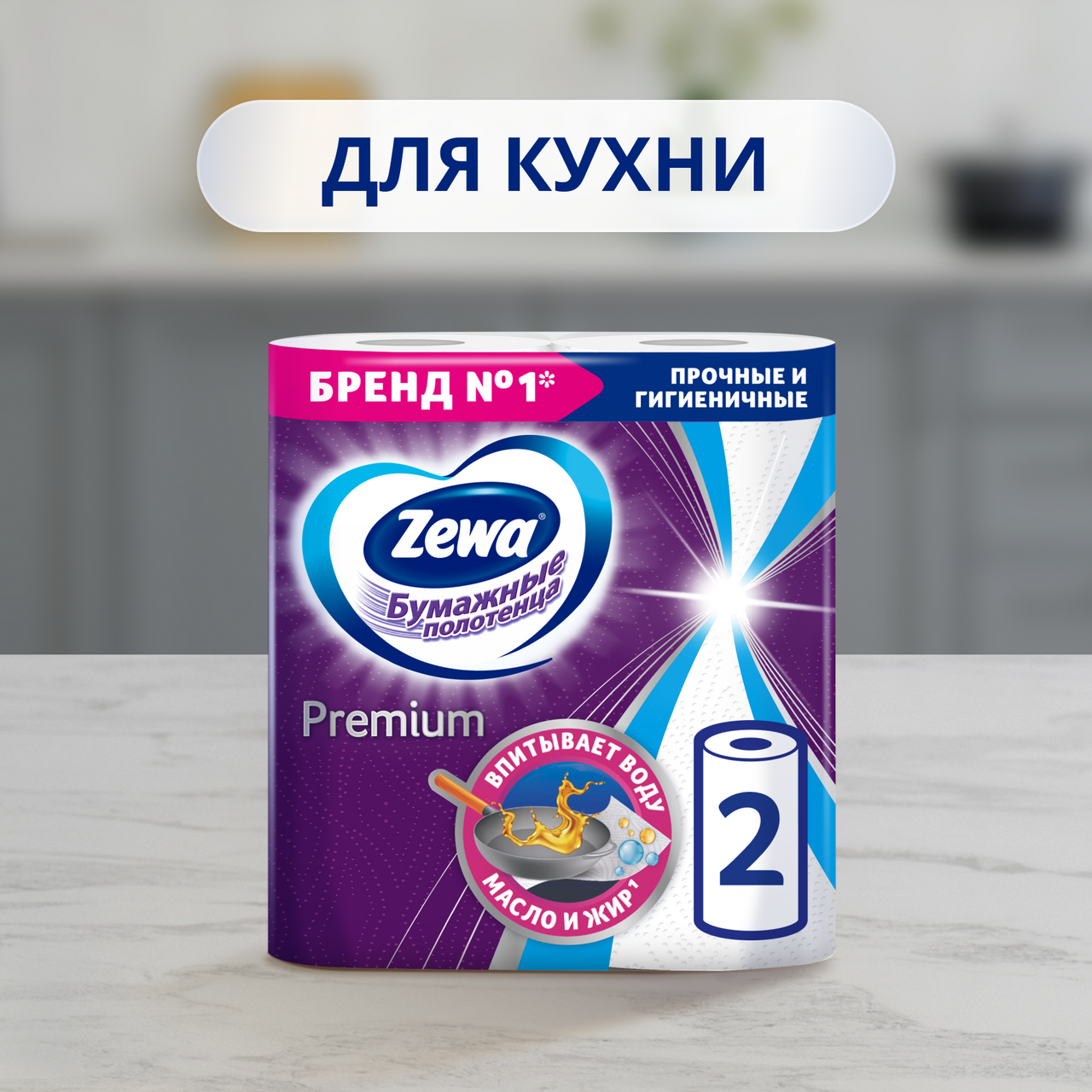 Бумажные полотенца Zewa Premium - незаменимый помощник современной хозяйки. Благодаря специальной текстуре они прочные, отлично впитывают влагу и подходят также для влажной уборки. Используйте бумажные полотенца Zewa Premium на кухне и во всем доме. Белые 2-х слойные прочные бумажные полотенца без рисунка.