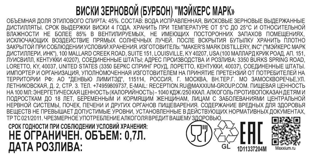 Maker’s Mark — премиальный виски ручной работы. Благодаря ручному контролю каждого этапа производства, этот виски обладает богатым и нежным вкусом. Maker’s Mark отличается от большинства бурбонов тем, что в его составе помимо кукурузы и соложенного ячменя, присутствует красная озимая пшеница. Maker’s Mark выдерживают в новой обожженной бочке из белого американского дуба от 4 до 7 лет в зависимости от погодных условий, за это время напиток приобретает карамельно-ванильные нюансы и элегантный золотистый цвет. Виски производится вручную, небольшими партиями, что позволяет строго контролировать качество ингредиентов, создавая великолепный напиток Характеристика вкуса: Богатый, маслянистый и одновременно очень нежный вкус с пшеничными тонами и свежими фруктами; Цвет: Золотисто-желтый; Аромат: Аромат насыщен нотами карамели, кожи и ванили, в нём также присутствует обожжённый дуб, подчеркивающий высокий класс напитка; Послевкусие: Обволакивающее и длительное.