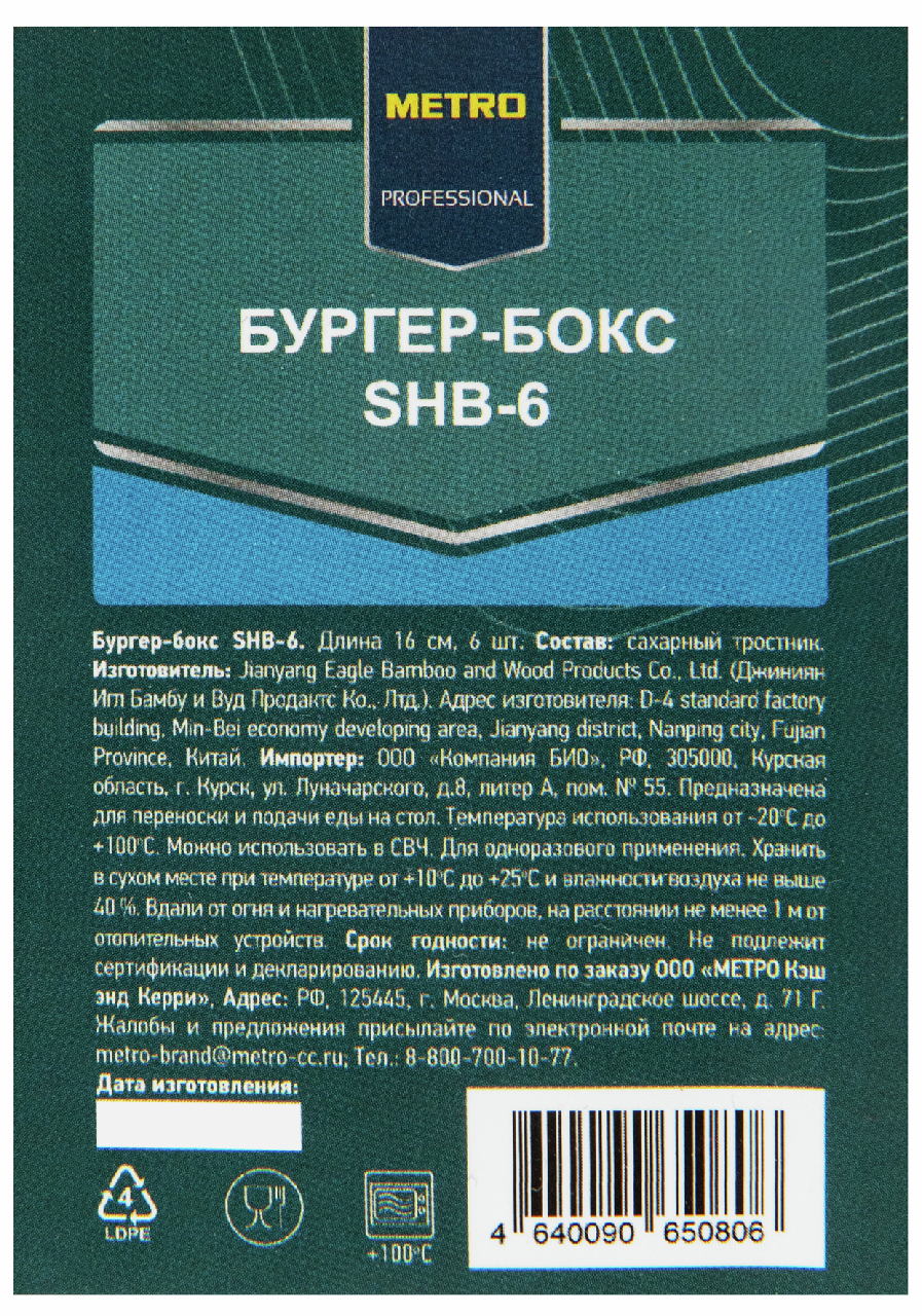 METRO PROFESSIONAL Бургер-бокс сахарный тростник, 16 см, 6 шт. изготавливаются из натурального материала — сахарного тростника. Это удобные и практичные одноразовые контейнеры для хранения и транспортировки пищевых продуктов. Такие коробочки, в которые можно положить не только бургеры и сэндвичи, но и разнообразные гарниры, кусочки пирога или десерты, удобно брать с собой на природу, на работу, давать детям в школу. Еда в них отлично сохраняется и довольно долго остается теплой. Прочная крышка исключает вероятность открывания и выпадения пищи. Изделия отлично удерживают влагу и жир внутри, имеют высокую устойчивость к перепадам температур, подходят для разогрева пищи в микроволновых печах. Еда в них, в отличие от пластиковой тары, не преет, оставаясь хрустящей и теплой. Также бургер-боксы просты и удобны в применении, отличаются компактными размерами, не впитывают посторонние запахи и не выделяют вредных веществ. К тому же эти функциональные контейнеры весьма привлекательно смотрятся. После использования бокс можно вымыть и отложить для дальнейшей эксплуатации (если изделие осталось сухим и чистым) или просто выбросить в соответствующий мусорный контейнер. Бургер-боксы полностью биоразлагаемы, абсолютно безопасны для здоровья человека и окружающей среды. Этот пункт особенно важен для тех, кто привык заботиться об экологии. При этом по прочности тростниковые одноразовые коробочки ничуть не уступают своим пластиковым аналогам.