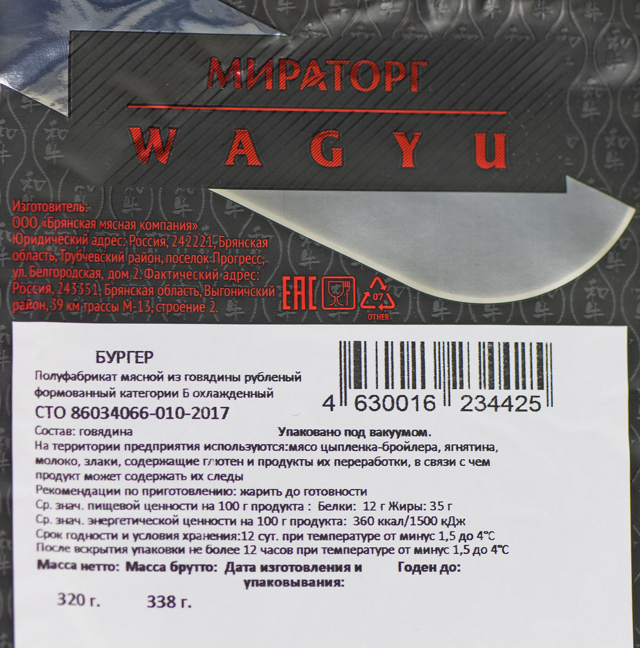 Бургер говяжий Мираторг Wagyu охлажденный, 320г